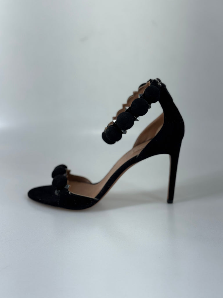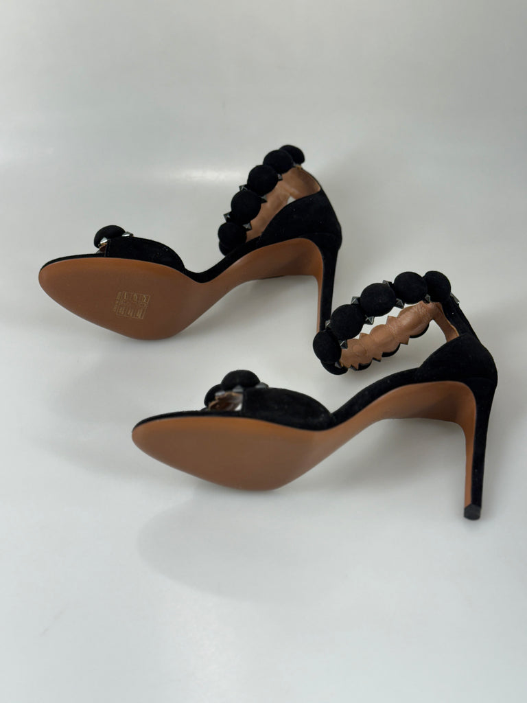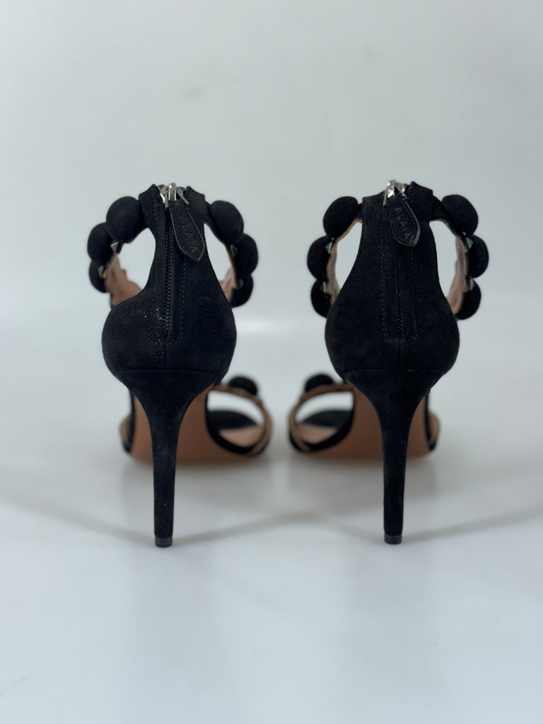 Eleganta Alaïa-sandaletter i mjuk, svart mocka. Den stilrena designen framhäver varumärkets signatur av tidlös elegans, medan formerna, detaljerna och mockans sammetslena textur ger ett modernt uttryck. Skräddad minimalism möter ikonisk couture-känsla. Den öppna sandalettmodellen skapar en lätt och feminin silhuett, perfekt balanserad för både kvällslook och dressade vardagsoutfits. Ett subtilt statement för dig som uppskattar kvalitet och design i varje steg. Tillverkade i Italien.