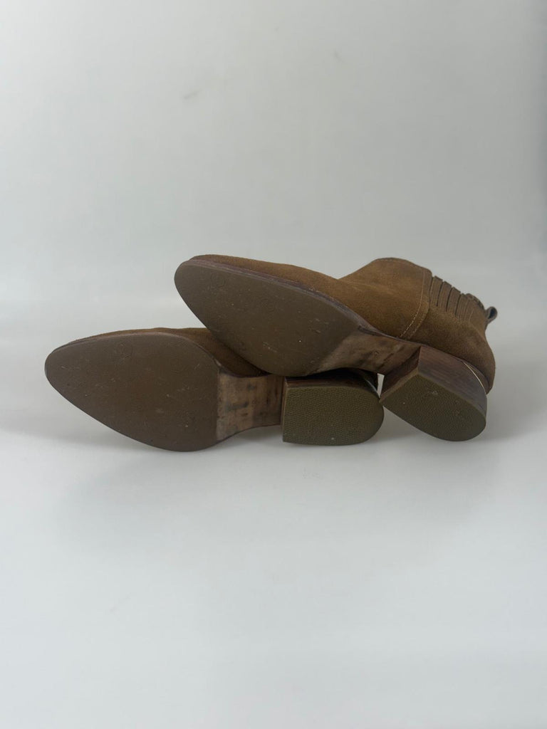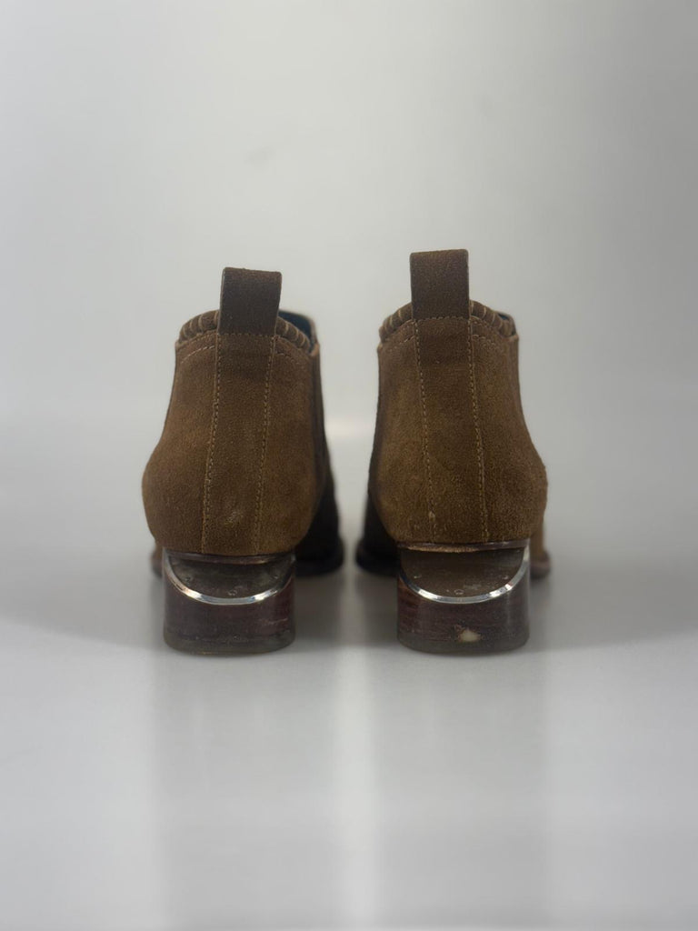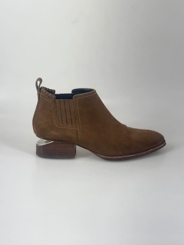 Statement-boots från Alexander Wang i kastanjebrun mocka, designade med en originell klack som ger skon en distinkt och modern karaktär. Det mjuka mockamaterialet möter den arkitektoniska formen på ett sätt som skapar en perfekt balans mellan edge och sofistikerad elegans. Ett uttrycksfullt val för dig som vill addera personlighet till din look utan att kompromissa med stil eller kvalitet. Ej box eller dustbag.
