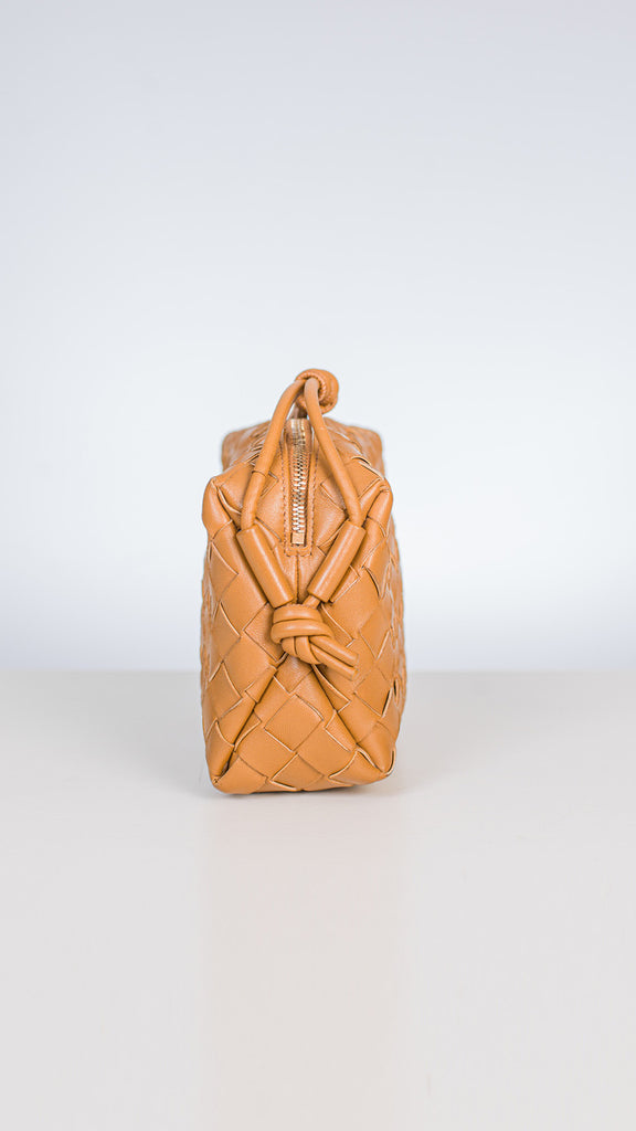 Beskrivning: Bottega Venetas 'Loop' mini axelremsväska är en perfekt liten crossbody väska att bära både till fest och till vardags. handvävd i Italien av remsor av mjukt läder med husets ikoniska intrecciato-teknik. Väskan är designad för att rymma det mest nödvändiga och har smala remmar med signaturknutar. Tillverkad i kamelfärgat lammskinn. Väskan stängs med en dragkedja och har ett rymligt innerfack.