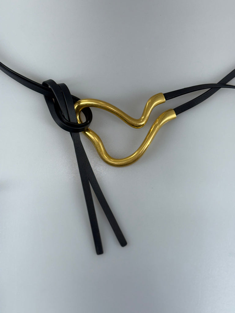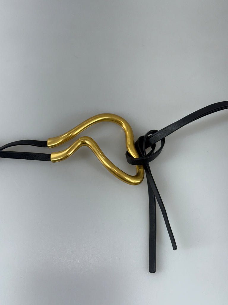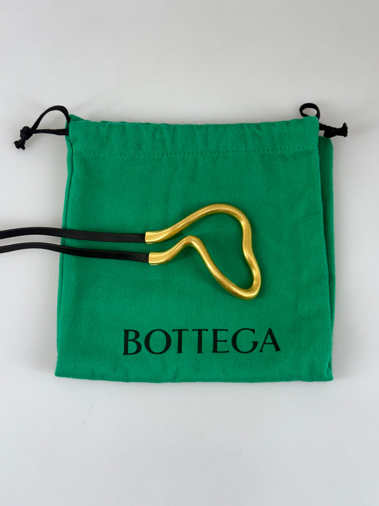 Lyft din stil med detta unika och konstnärliga skärp från Bottega Veneta. De två tunna läderremmarna flyter samman med ett skulpterat guldspänne på ett sätt som ger en lekfull men designad form. Resultatet är ett skärp som känns stilmedvetet, elegant och oväntat på samma gång. Perfekt för dig som vill addera ett exklusivt statement till en enkel klänning, lyfta en skräddad look eller ge din outfit en konstnärlig twist. Originaldustbag medföljer.
