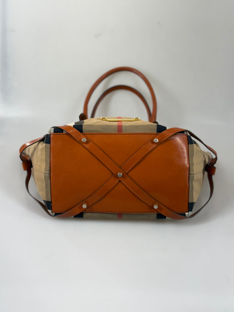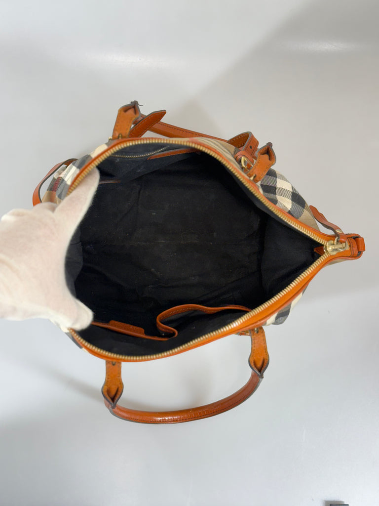 Upplev tidlös brittisk elegans med denna ikoniska Burberry House Check-väska som kombinerar den välkända rutiga Burberry-designen i beige och cognacsbrunt läder, vilket skapar en sofistikerad och mångsidig accessoar som passar lika bra till vardag som till fest. Den genomtänkta designen erbjuder både stil och funktion med ett rymligt huvudfack och strukturerade remmar. En chic väska för dig som uppskattar klassisk och tidlös design. Tillverkningsår ca 2013. Märkt med serienummer och levereras med dustbag.