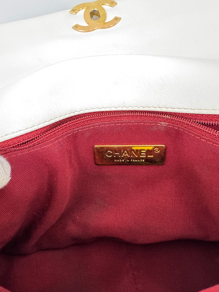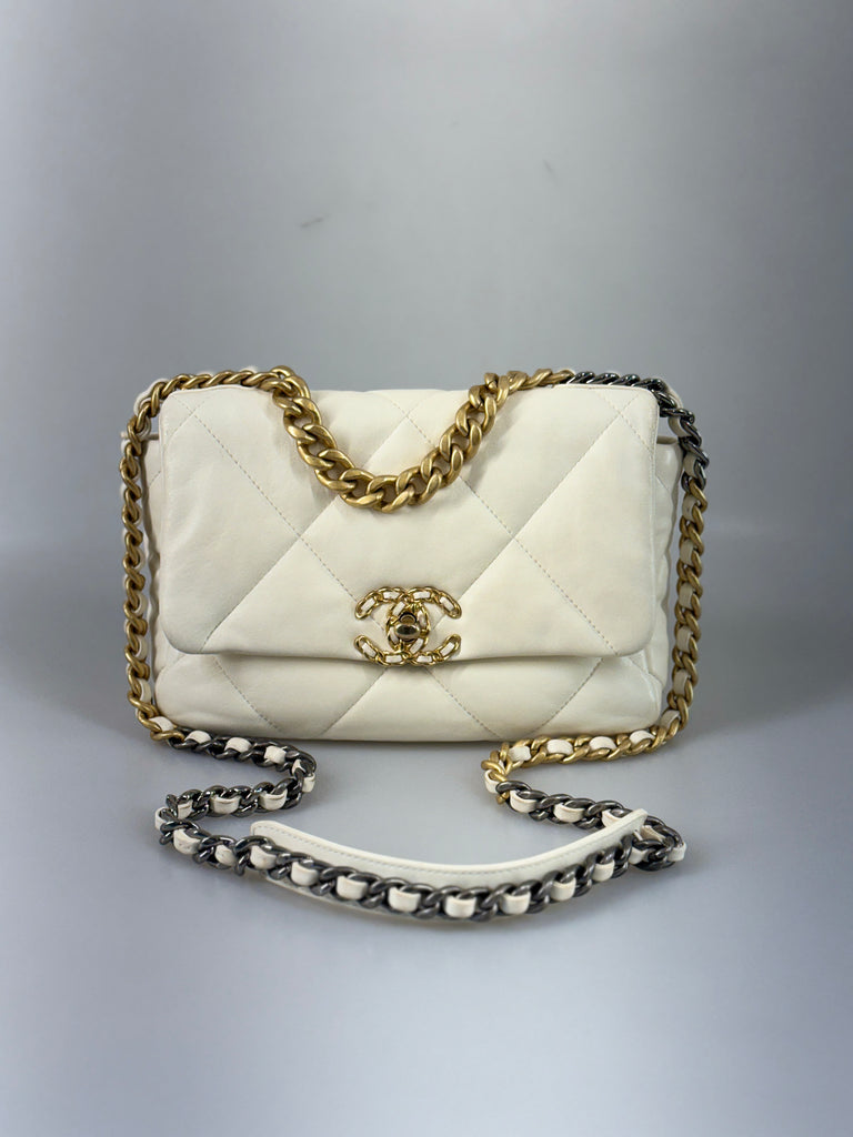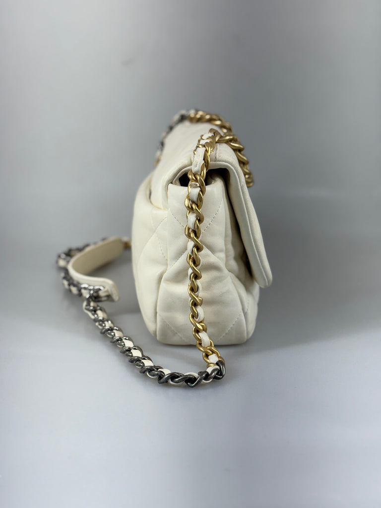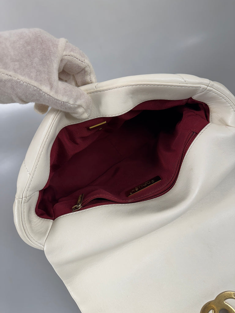 Beskrivning: Denna Chanel 19-handväska är tillverkad i vit getskinn och har en kedja i en kombination av guld- och silverfärgad metall med rutenium-finish. Väskan är fodrad med vinrött tyg och prydd med Chanels emblem inuti. Den stängs med Chanels ikoniska CC-vridlås och har ett stort innerfack samt ett mindre fack med dragkedja. Framsidan är dekorerad med CC-logotypen och omgiven av deras klassiska kedjeväv. På baksidan finns ett ytterligare förvaringsfack med vinrött foder och en magnetknapp. Väskan är numrerad, microchip-märkt (E-serie) och har en tidlös design.
