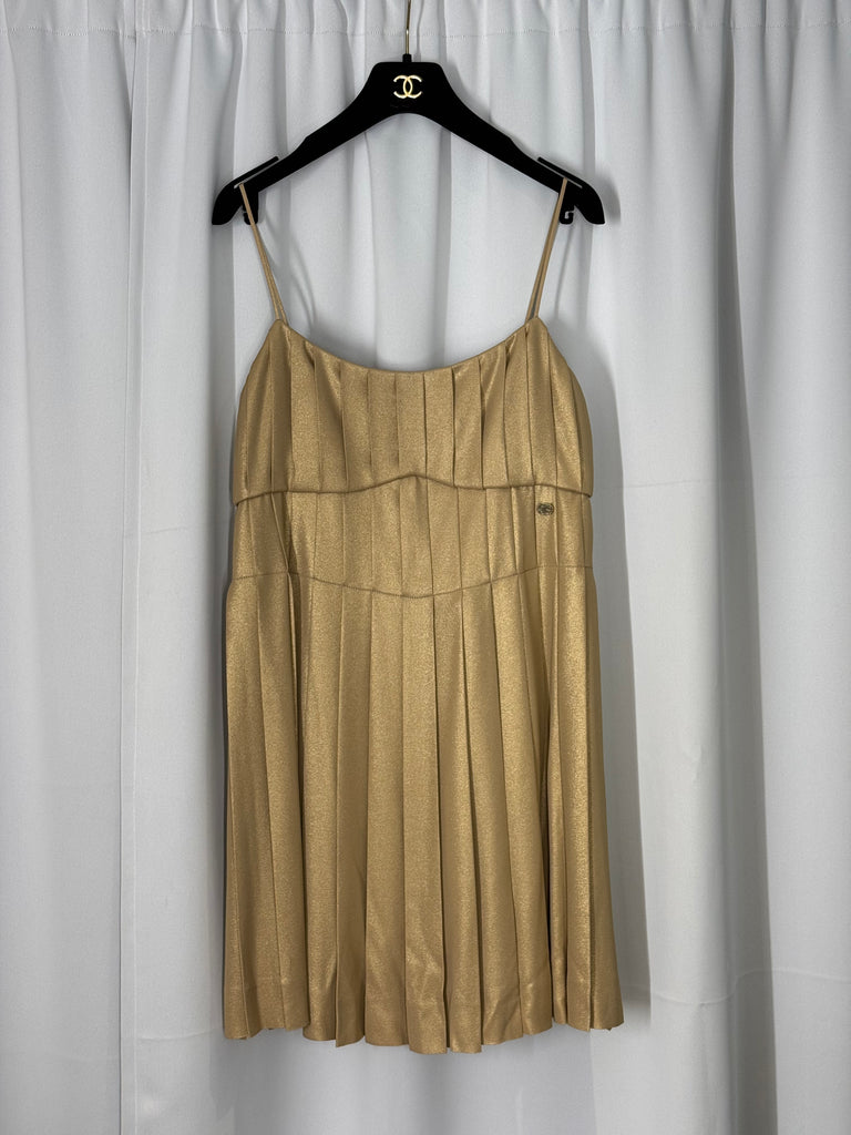 Elegant klänning från Chanel i plisserad georgette crêpe – ett luftigt, följsamt silkestyg som rör sig vackert med varje steg. Den mjuka glansen ger ett subtilt skimmer i den distinkta men stilrena guldnyansen, och de fina plisseringarna framhäver siluetten på ett elegant och ledigt sätt. En tidlös och feminin modell som passar lika fint till fest som till mer avskalade looks. Chanel-karaktären märks i varje detalj – från materialvalet till skärningen. Levereras med original dustbag samt en elegant Chanel CC-galge – en helhet med känsla för både design, hantverk och historia.