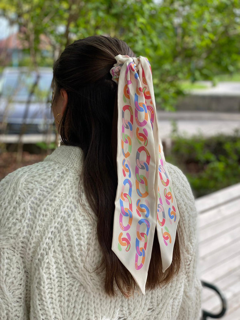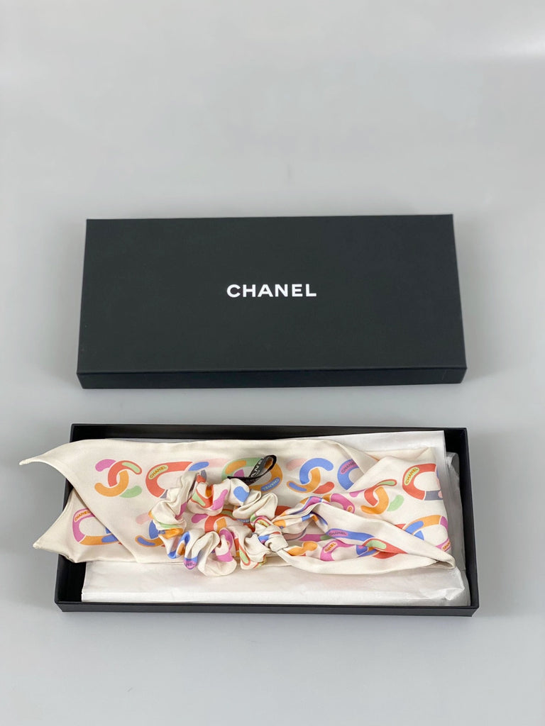 Beskrivning: Lyxa till din outfit lite extra med denna vackra scrunchie i håret från Chanel. Dess färgglada nyanser ger en känsla av sommar och glädje!