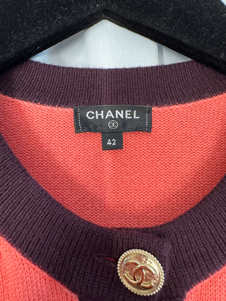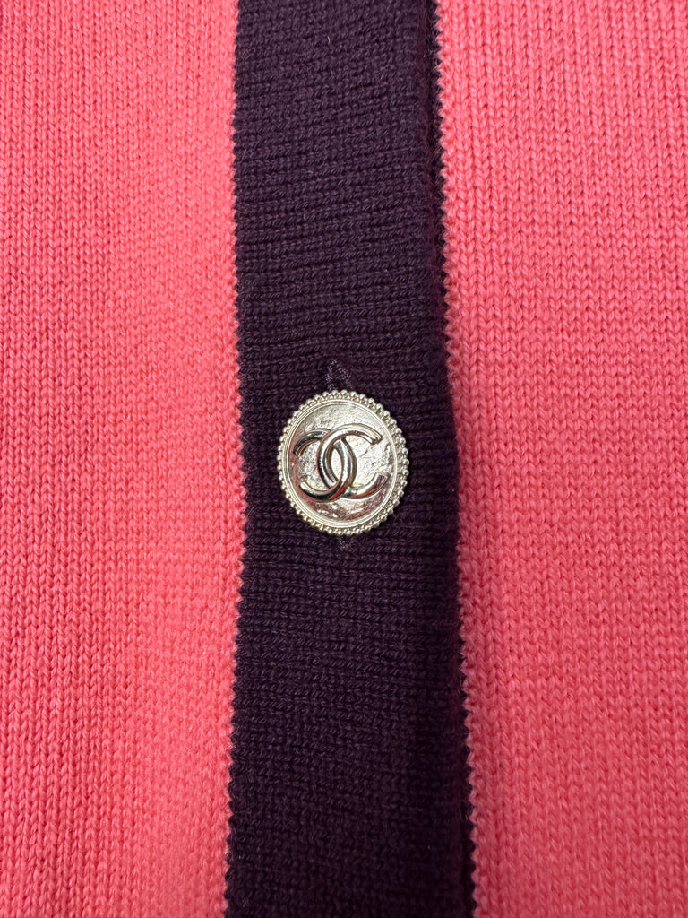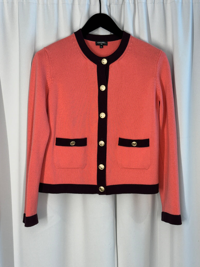 En tidlös och klassisk kofta från Chanel, tillverkad i mjuk kashmir som faller vackert till den rena silhuetten. Den aprikosrosa nyansen ger ett feminint och elegant uttryck, medan kontrasten till den varmt mörklila – nästan plommonfärgade – nyansen tillför en lekfull touch till en klassisk modell. Den stilrena silhuetten gör plagget lika rätt till vardags som till mer uppklädda tillfällen. Ett ikoniskt plagg – tidlös karaktär med en lekfull touch – för dig som uppskattar kvalitet, design och elegans.