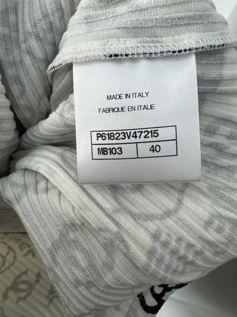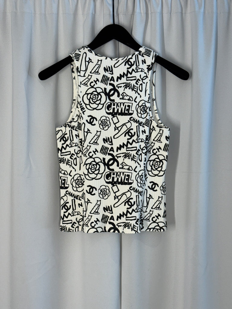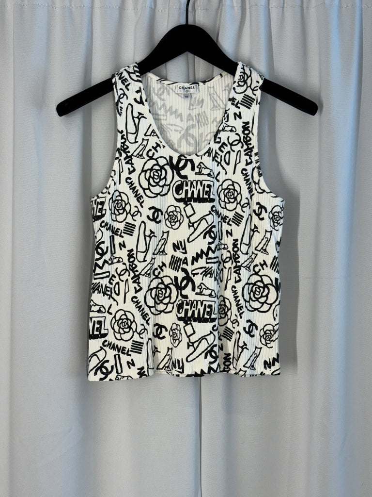 Ett unikt och tufft linne från Chanel i en diskret ribbad textur som skapar en smickrande silhuett och tillför en avslappnad känsla. Den klassiska basen bryts av ett svart, vit konstnärligt grafitti-mönster – lekfullt, nästan handritat i uttrycket, med en rörig och kreativ estetik som ger plagget personlighet och attityd. Perfekt att bära under en kavaj för en subtil statement-look, eller som det är för en mer edgy och självsäker styling. Ett linne för dig som uppskattar ikonisk design med en modern twist.
