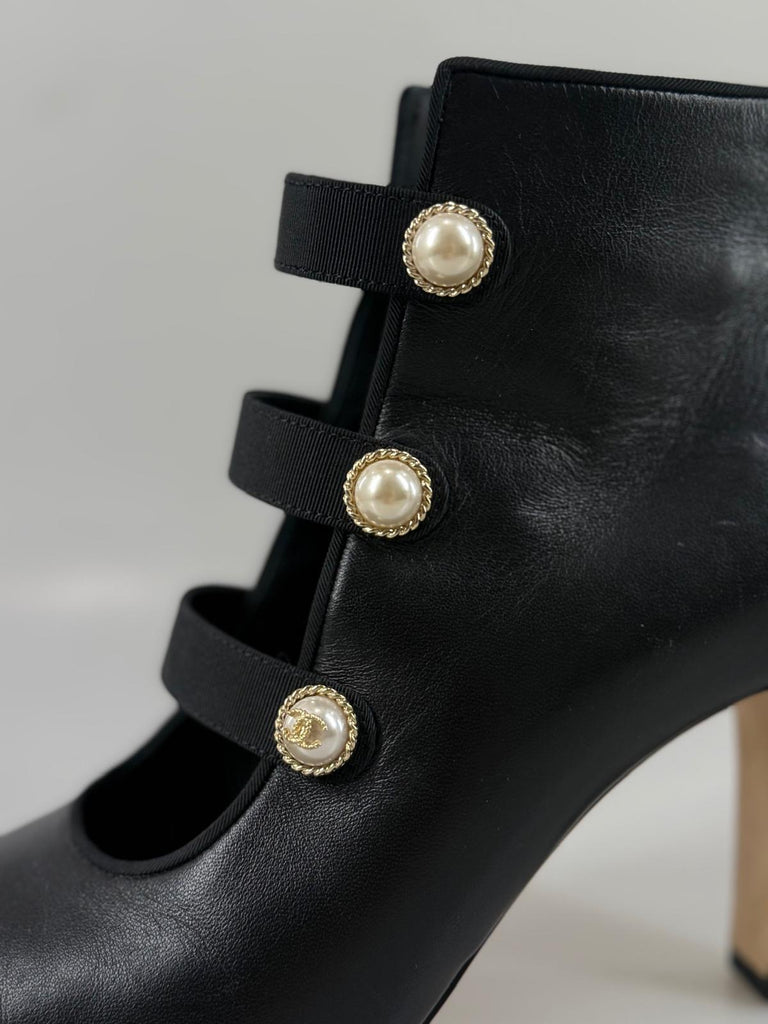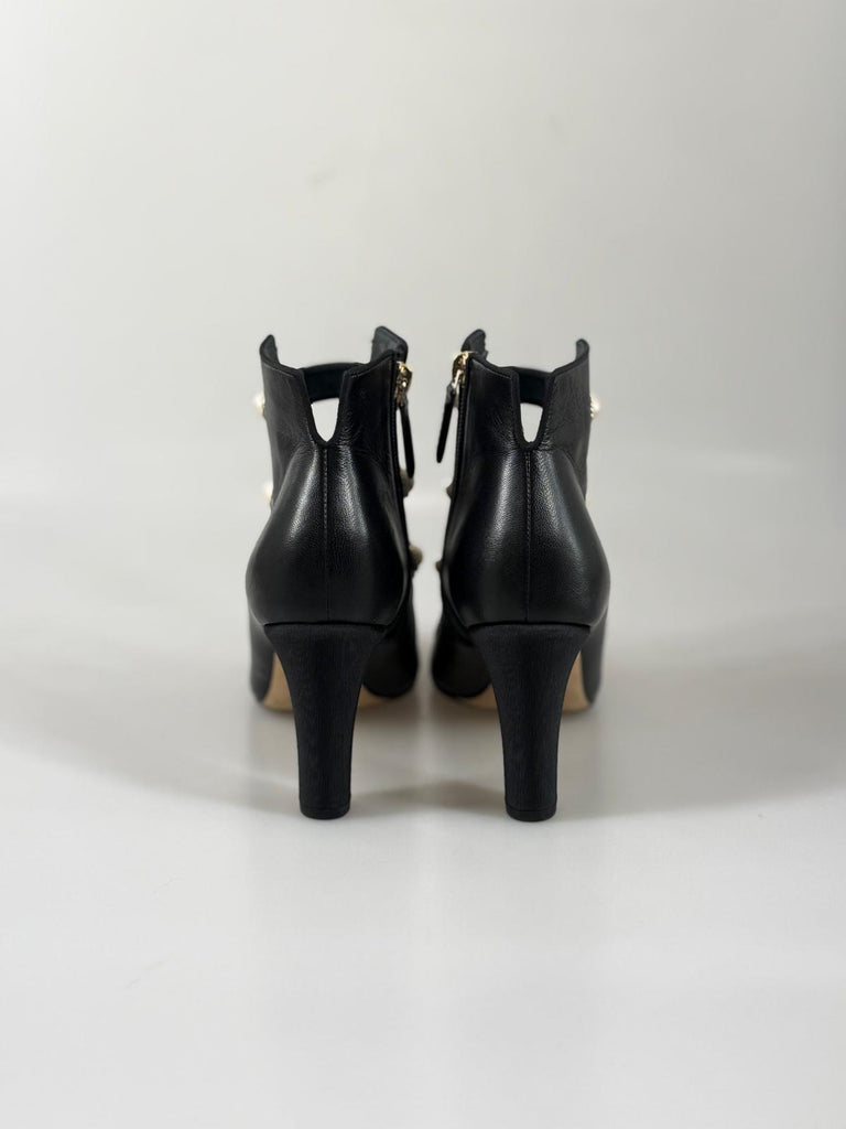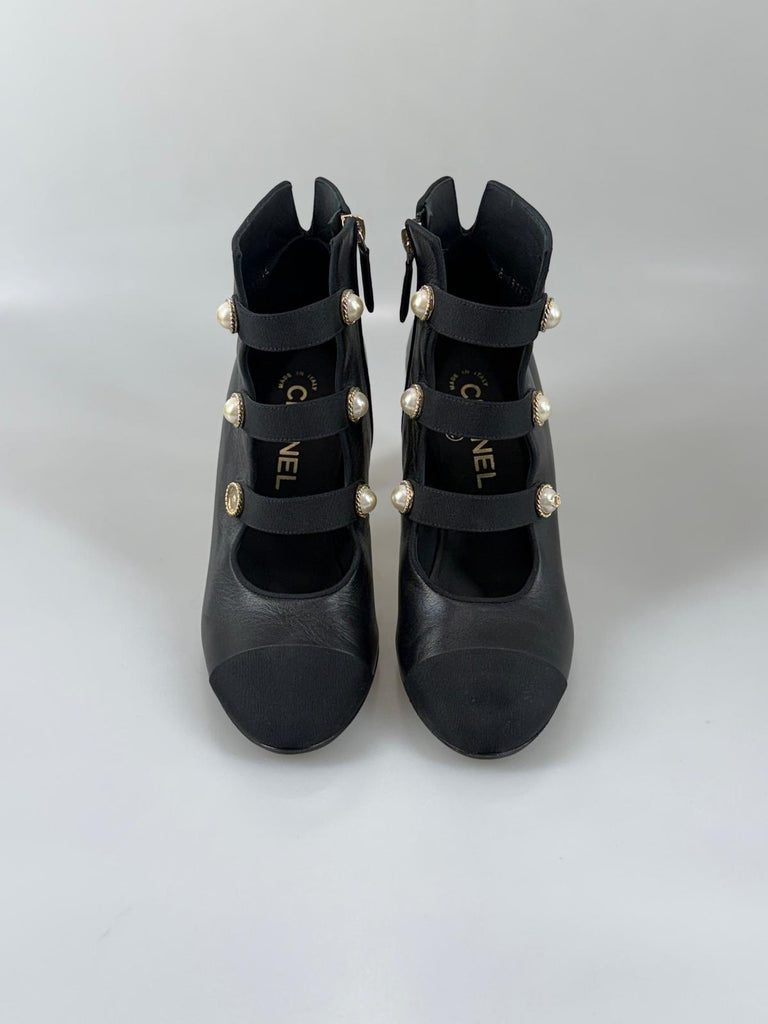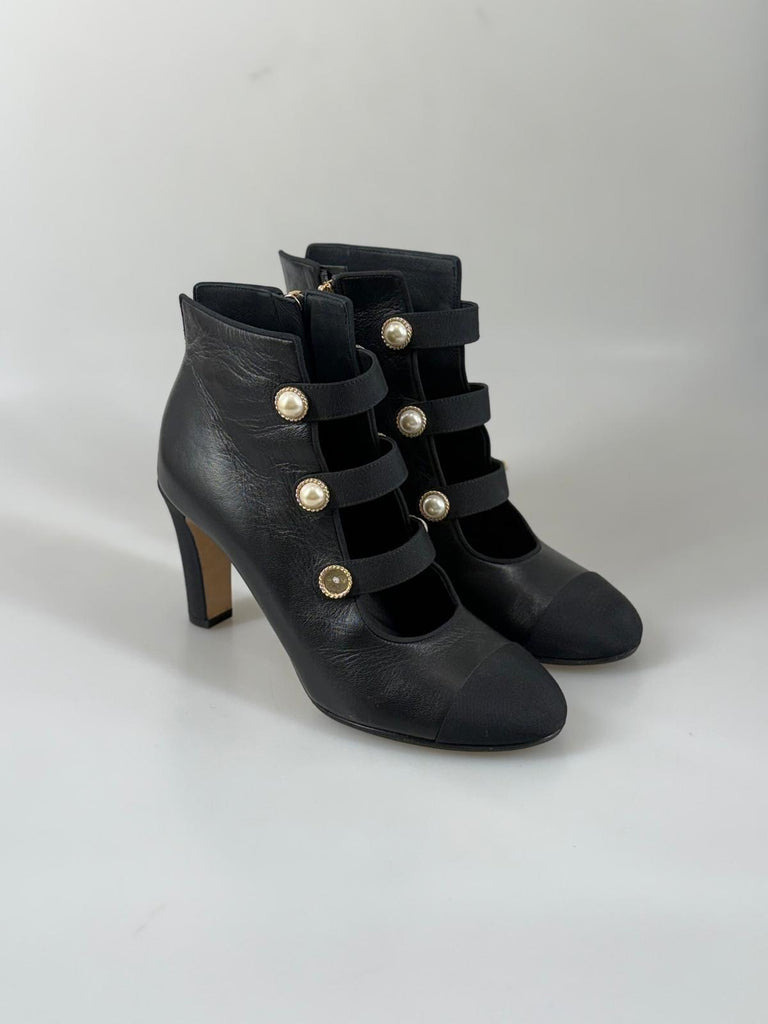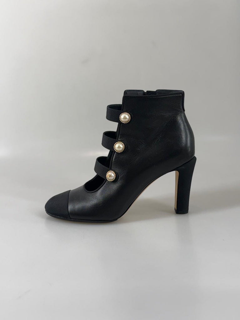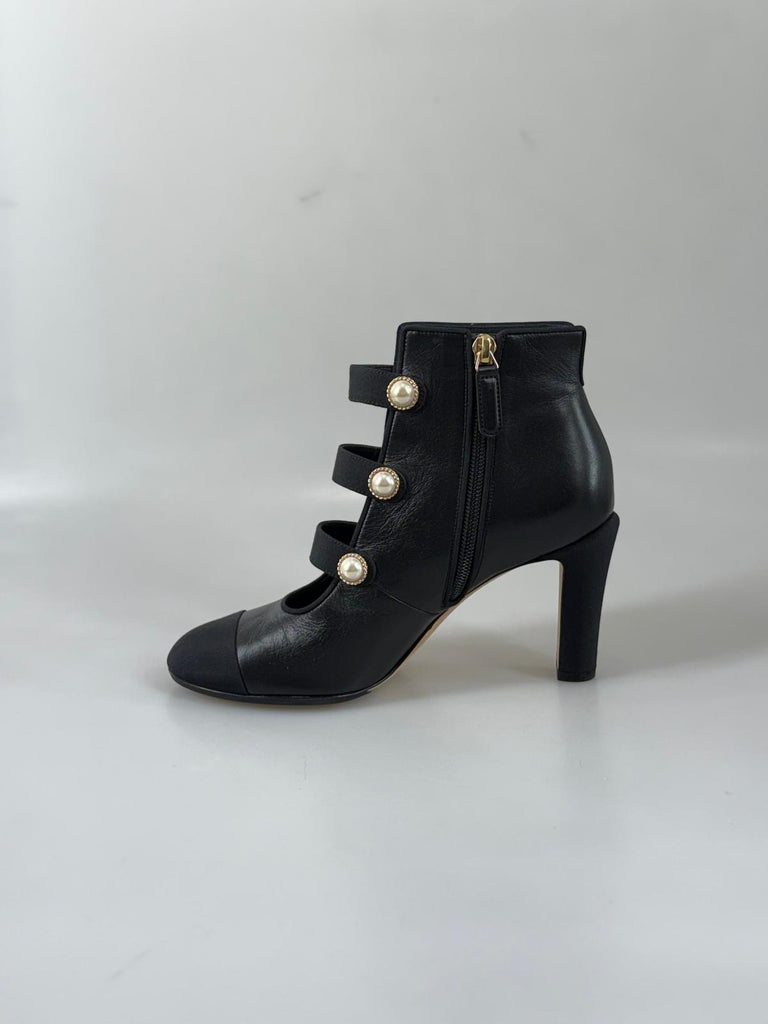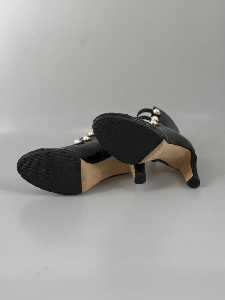 Subtil lyx möter ikonisk Chanel-estetik i dessa exklusiva stövletter. Tillverkade i mjukt svart kalvskinn ger de med sin häftiga design en sofistikerad, perfekt skulpterad silhuett som smickrar foten. De distinkta pärldetaljerna adderar en raffinerad touch av couture och gör skorna lika eleganta som de är unika. Perfekta till dressade outfits, en chic stadslook eller kvällens uttryck – när du vill addera distinkt och klassisk glamour, med Chanel elegans.