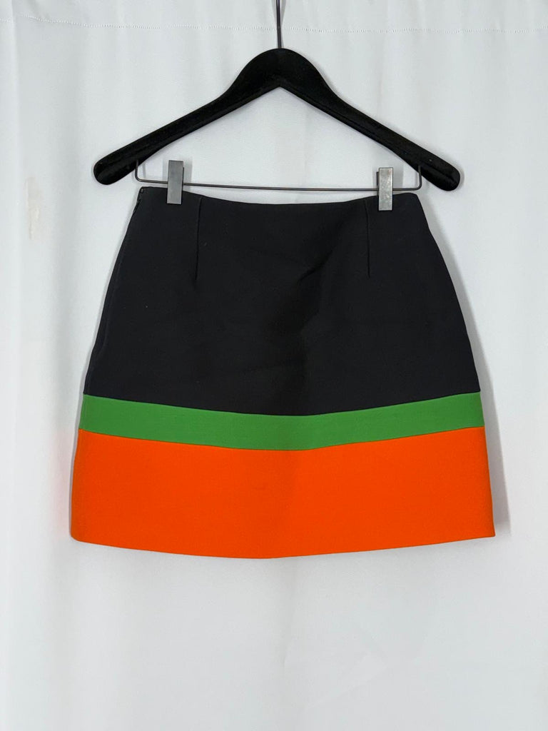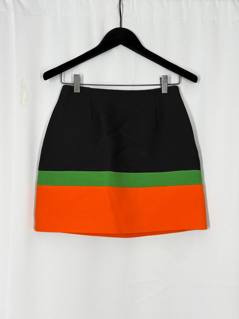 En elegant minikjol från Christian Dior i en häftig färgpalett av svart, grönt och orange. Designen präglas av rena linjer och en elegant silhuett, vilket ger ett modernt men samtidigt tidlöst uttryck. En perfekt balans mellan statement och elegans – lika självklar till vardag med en enkel överdel som till festligare tillfällen i en mer dressad look. Ett ikoniskt Dior-plagg för den med känsla för kvalitet och design.