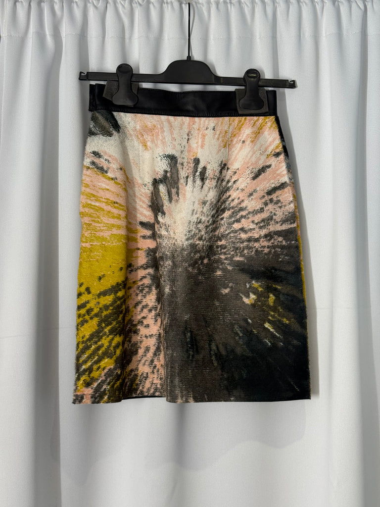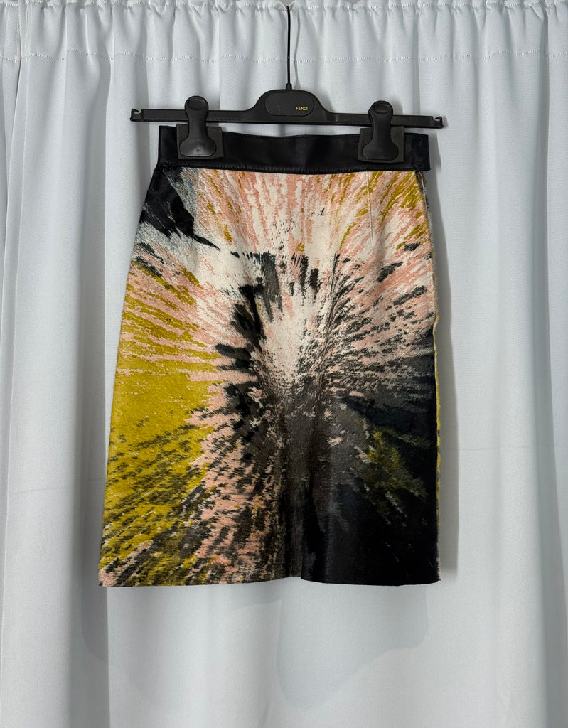 Den här kjolen från Fendi är ett utsökt exempel på italienskt hantverk när det är som allra bäst. Med en perfekt balans i struktur ger den en känsla av modern elegans, där varje detalj andas kvalitet och stilmedvetenhet. Det svarta midjebandet framhäver siluetten på ett smickrande sätt, medan den handplockade färgpaletten ger en elegant men lekfull känsla. Perfekt för dig som älskar mode med attityd – och som inte kompromissar med kvalitet. Iögonfallande men elegant – ett konstverk som lyfter garderoben och sätter pricken över i:et i varje outfit.