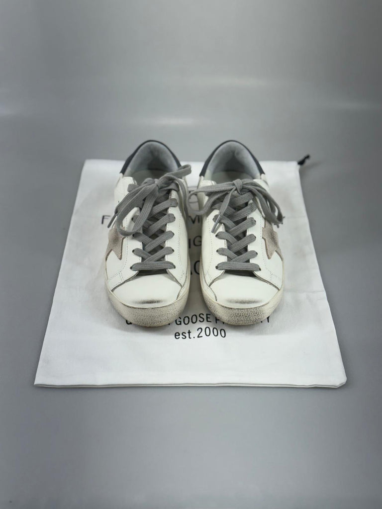 Golden Goose Super-Star i vitt och grått är den perfekta kombinationen av avslappnad stil och attityd. Den klassiska modellen med subtilt slitna detaljer och en tydlig stjärna på sidan, ger en cool kontrast mot den ljusa färgskalan. Varje detalj är noga utvald och designad för att ge känslan av ett par favorit redan från första steget. De passar lika bra till vardags som när du vill lyfta en enklare outfit med en cool touch. Ett självklart val för dig som vill ha sneakers med både karaktär och komfort. Levereras med originalbox, dustbag och tags. Pris: 1850 kr