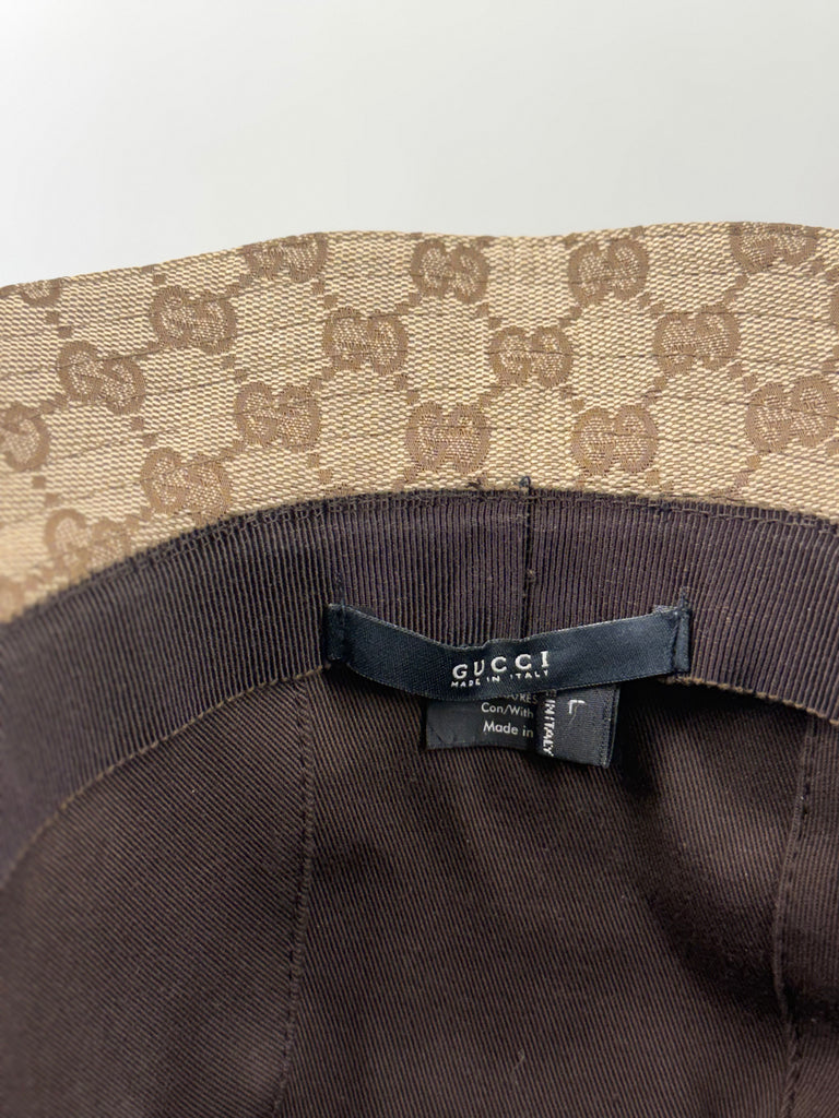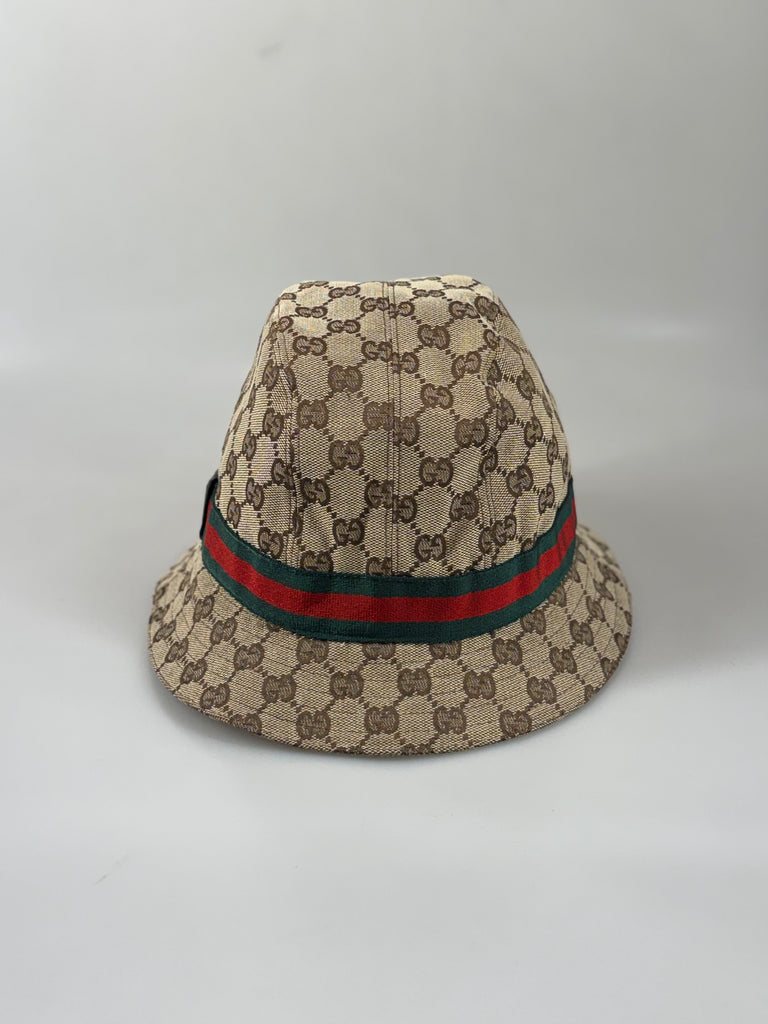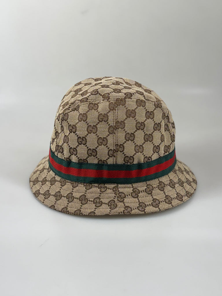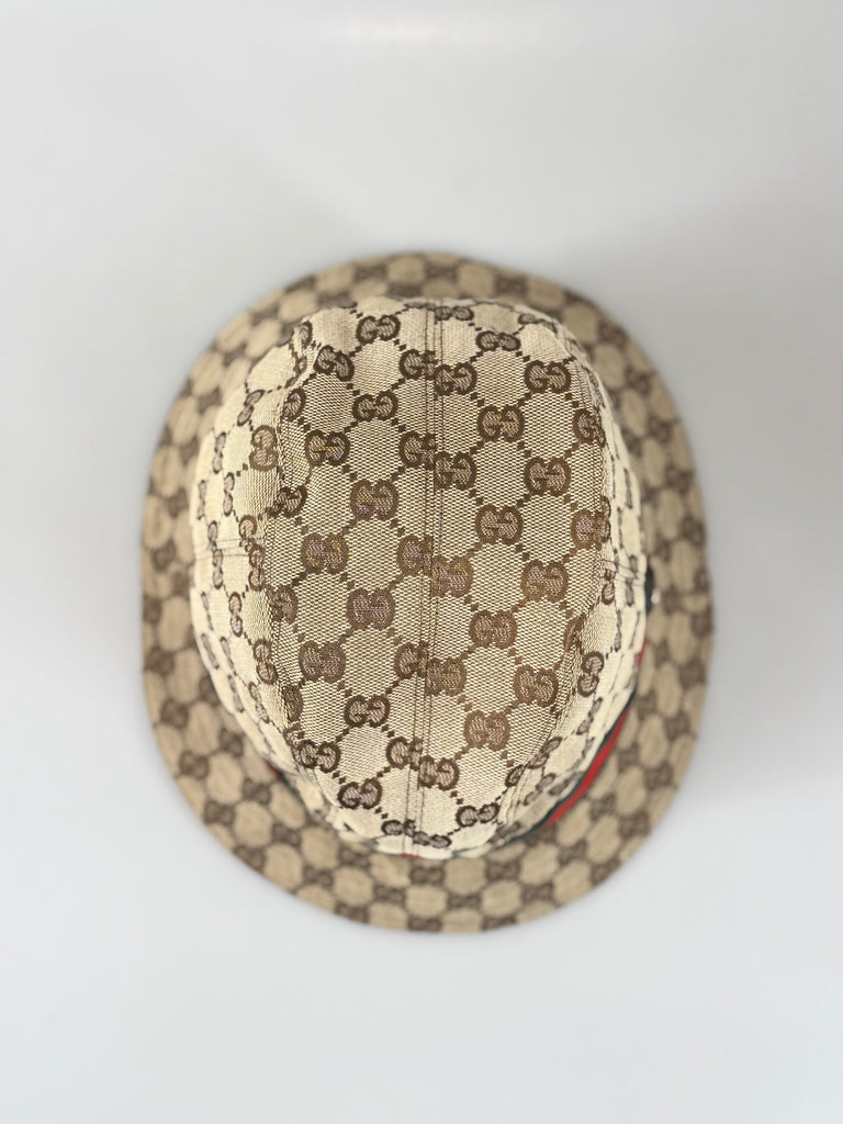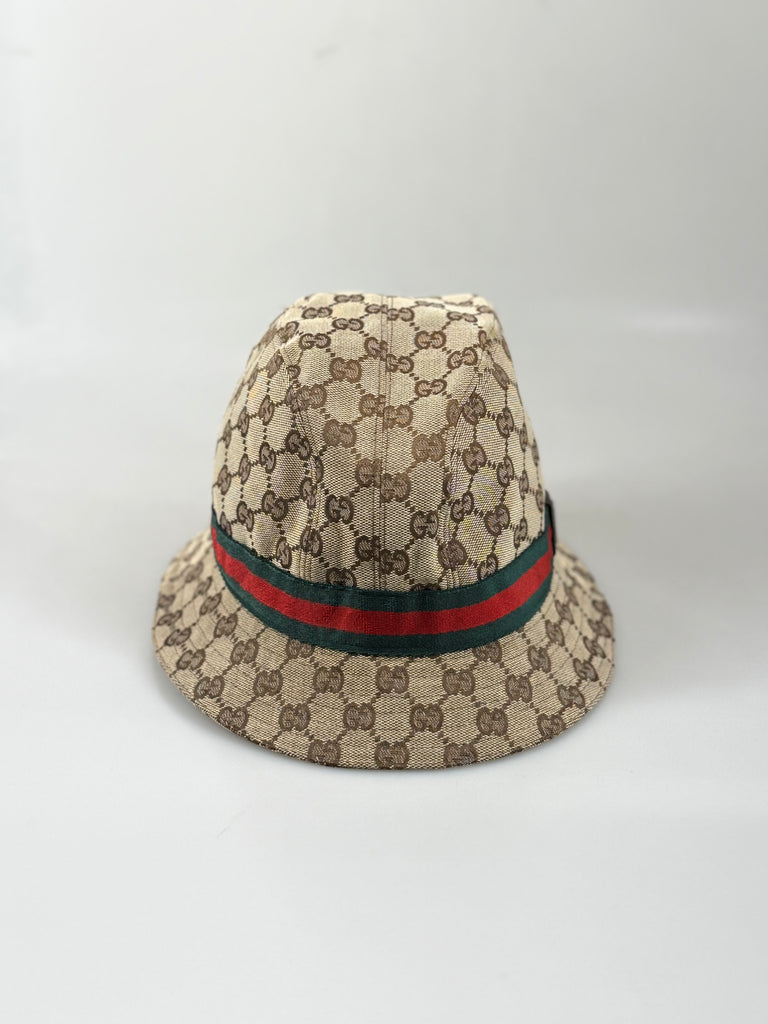 Beige Gucci bucket hat med det klassiska GG-monogrammet, formgiven i en mjuk och följsam kvalitet som ger ett avslappnat men välklätt intryck. Den ljusa tonen tillsammans med den ikoniska designen skapar en klassisk balans som passar lika bra till vardagliga outfits som till mer genomtänkta looks. En tidlös accessoar med tydlig identitet.