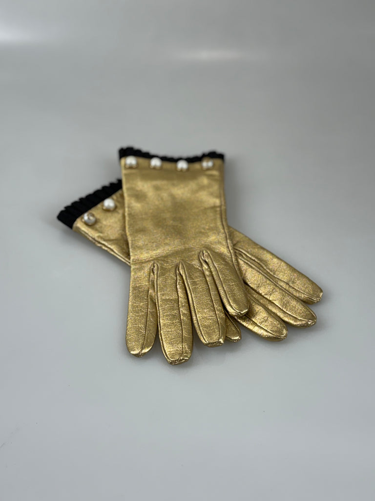 Eleganta Gucci skinnhandskar i guld som kombinerar funktion och design på ett subtilt men iögonfallande sätt. Den mörka detaljen adderar en djup touch och pärlorna en elegant men lekfull känsla. Det mjuka skinnet ger en exklusiv känsla och en perfekt passform, medan den gyllene tonen adderar en sofistikerad glamour. Handskarna är ett stilfullt statement som lyfter varje outfit och ger en känsla av genomtänkt elegans – perfekta för dig som uppskattar detaljer, kvalitet och ikonisk design. Tillverkade i Italien.