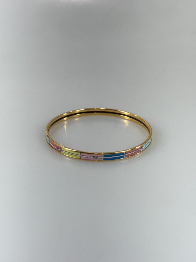 Ett ikoniskt armband från Hermès, den smala Bangle Printed Enamel i generös GM-storlek och charmiga toner. Den rena guldpläterade ytan mot de mjukt pastellfärgade nyanserna skapar den perfekta balansen mellan lekfull elegans och tidlös lyx. Bär det ensamt för en stilren, minimalistisk look eller kombinera med flera smycken för en mer personlig stil med en touch av färg. En signaturaccessoar som fångar Hermès känsla för hantverk, stil och design – lika rätt till vardag som till fest. Märkt med serienummer.