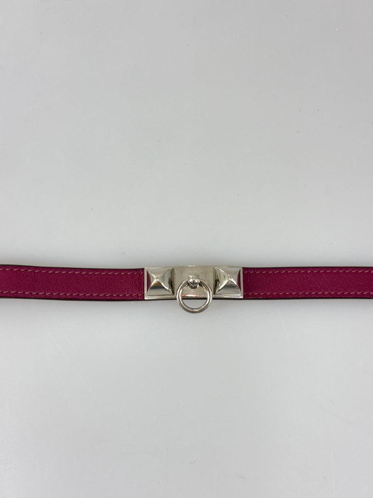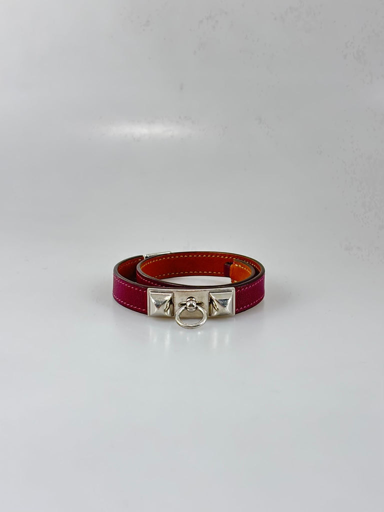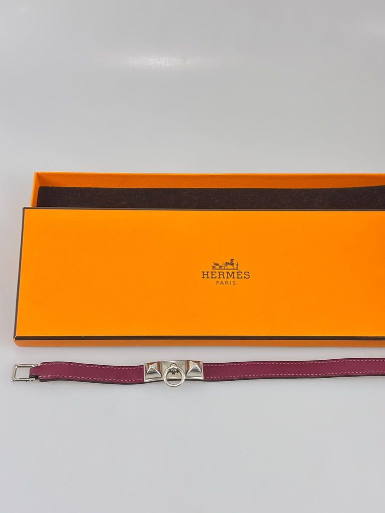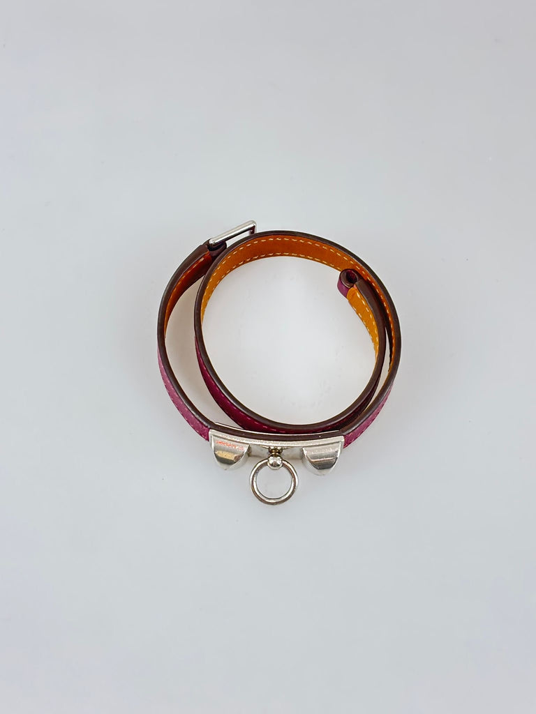 Hermès Rivale Double-armband – en ikonisk accessoar som förenar tidlös elegans med modern touch. Tillverkat i mjukt läder i en djup och rik plommon nyans med subtila toner av rosa, lila och rött som ger armbandet ett levande uttryck. Bandet omsluter handleden och pryds med lekfulla detaljer som skapar en perfekt siluett. Rivale Double lyfter enkelt varje look och speglar Hermès klassiska design och hantverk – kvalitet och färg med karaktär. Originalbox medföljer.
