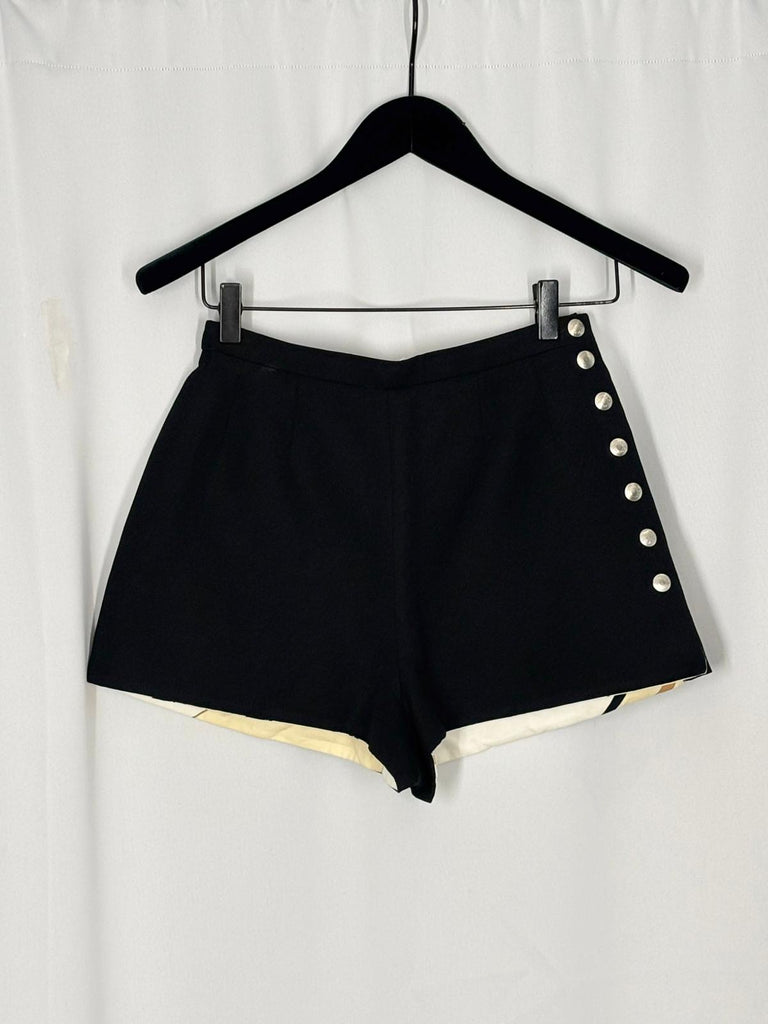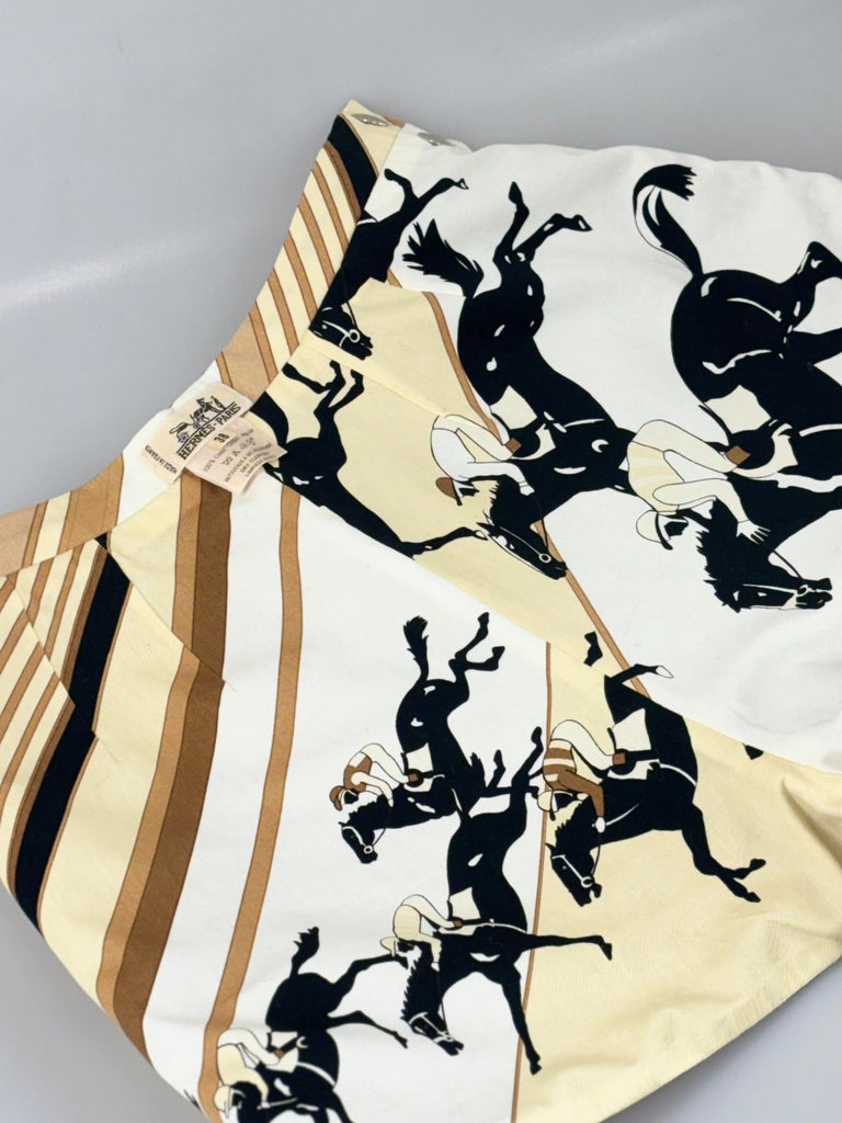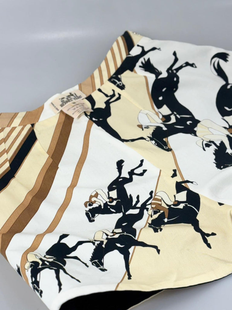 Beskrivning: Eleganta vändbara korta shorts från Hermès som kombinerar sofistikerad design med mångsidig elegans. Modellen erbjuder två distinkta uttryck i ett och samma plagg, vilket gör dem både stilfulla och praktiska i garderoben. Den ena sidan går i en djup svart ton med silvertonade detaljer som ger ett modernt och stilrent intryck. När shortsen vänds framträder en mer uttrycksfull sida i en harmonisk färgpalett av svarta hästar, beige, ljusgul och brun med cremevita inslag, där de silvertonade detaljerna adderar en diskret men exklusiv finish. Resultatet är ett par eleganta och genomtänkta shorts med en tidlös känsla – lika perfekta för avslappnade sommardagar som för en mer uppklädd och sofistikerad look.