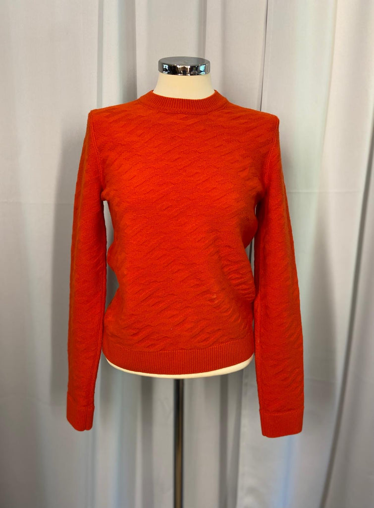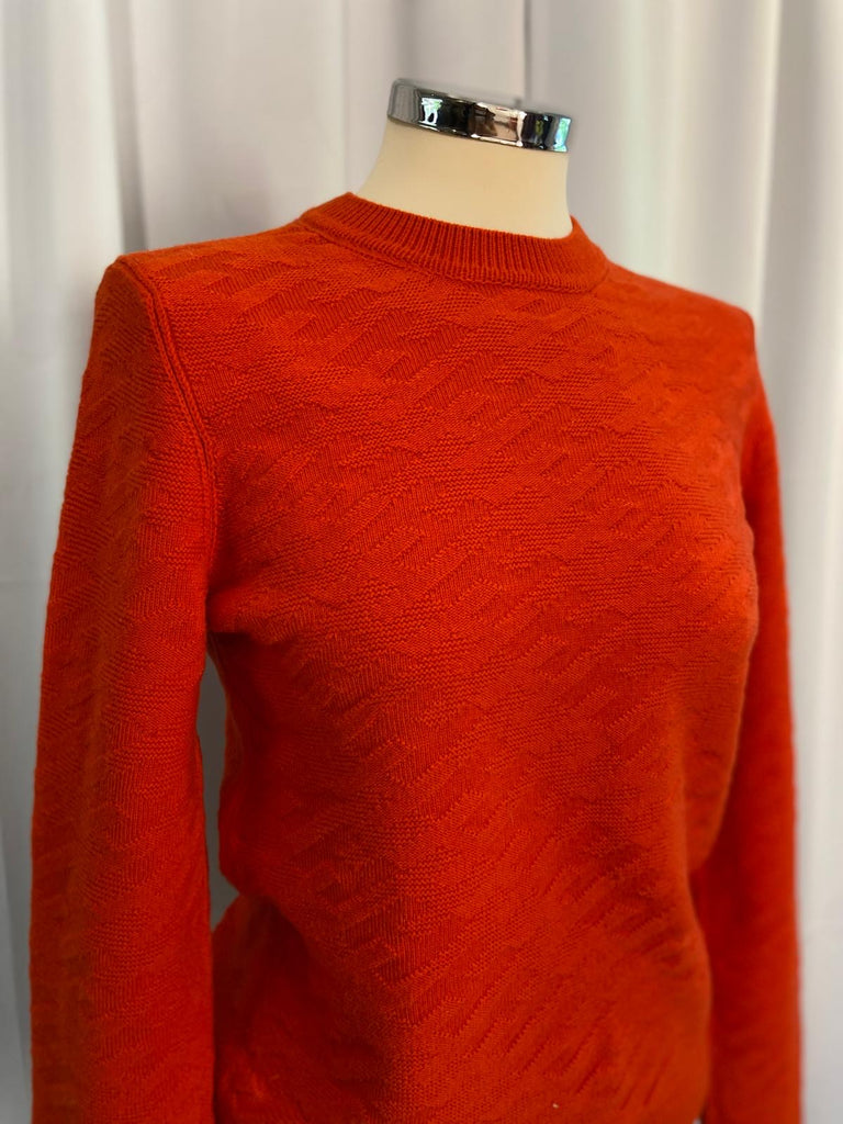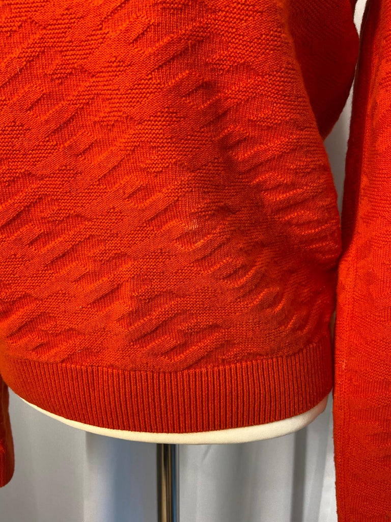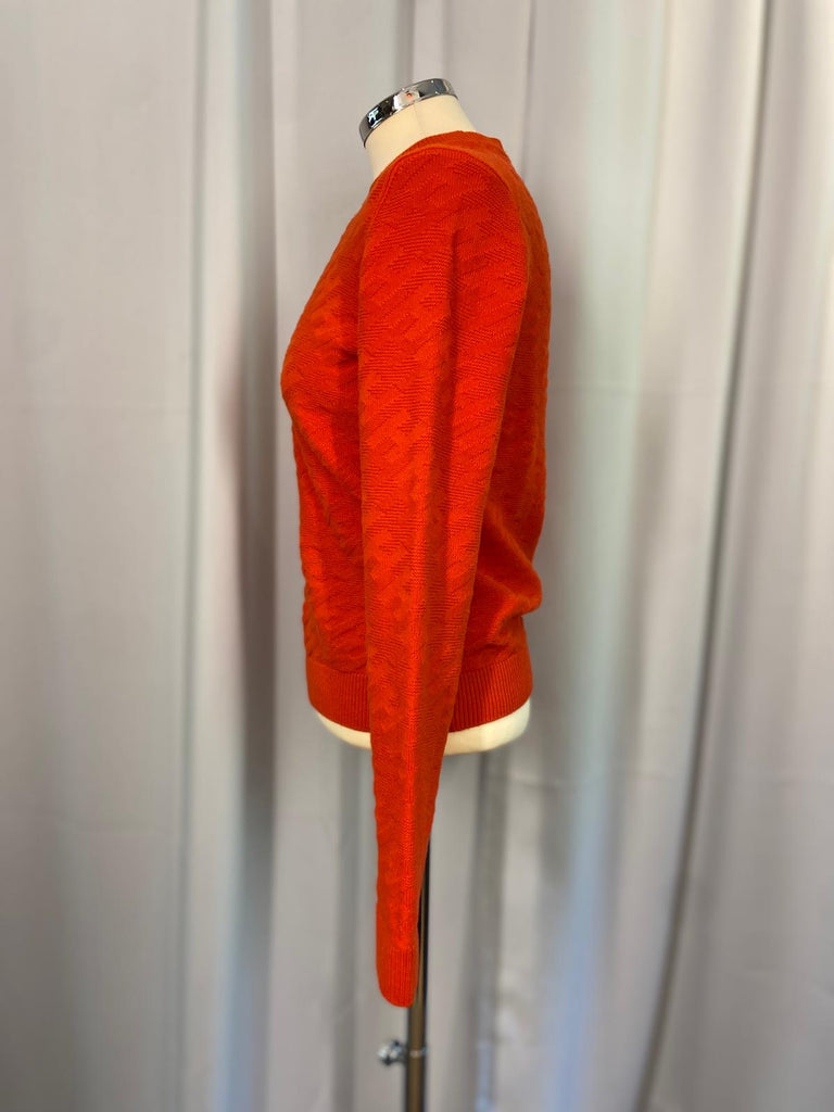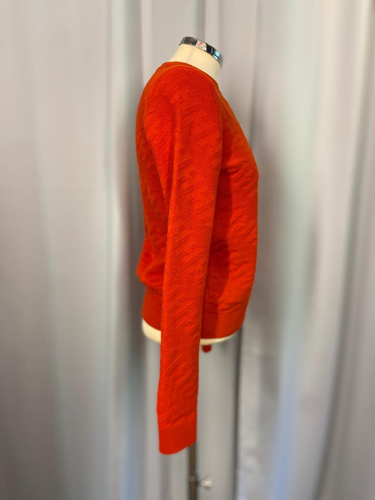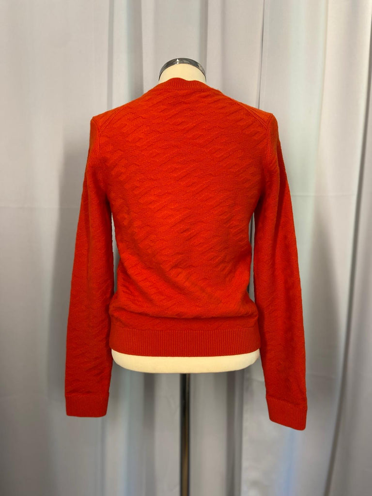 En stilren stickad tröja från Hermès i en varm röd nyans. Det subtila mönstret ger plagget en vacker struktur och ett levande uttryck. Tröjan har en mjuk, något formad silhuett och gör sig lika fint till ett par skräddade byxor som över en klänning eller till denim. En mångsidig favorit för både vardag och mer sammansatta looks – alltid med en känsla av balans och finess.