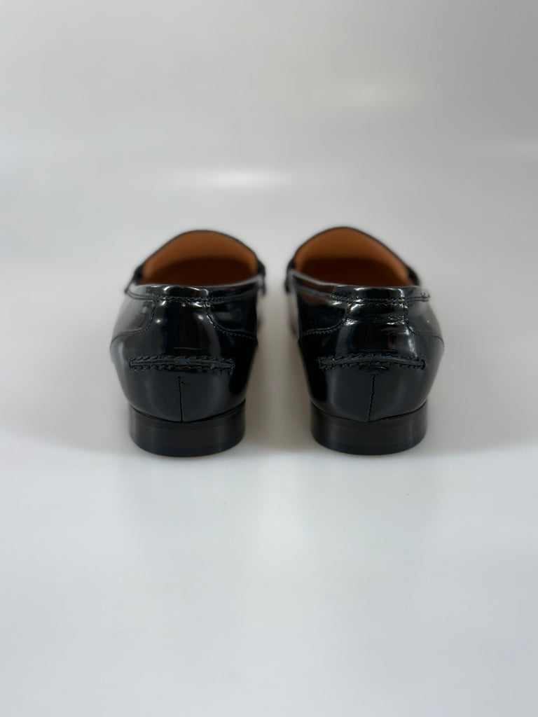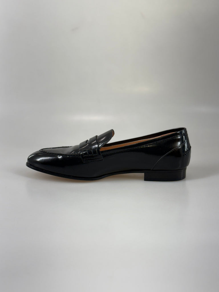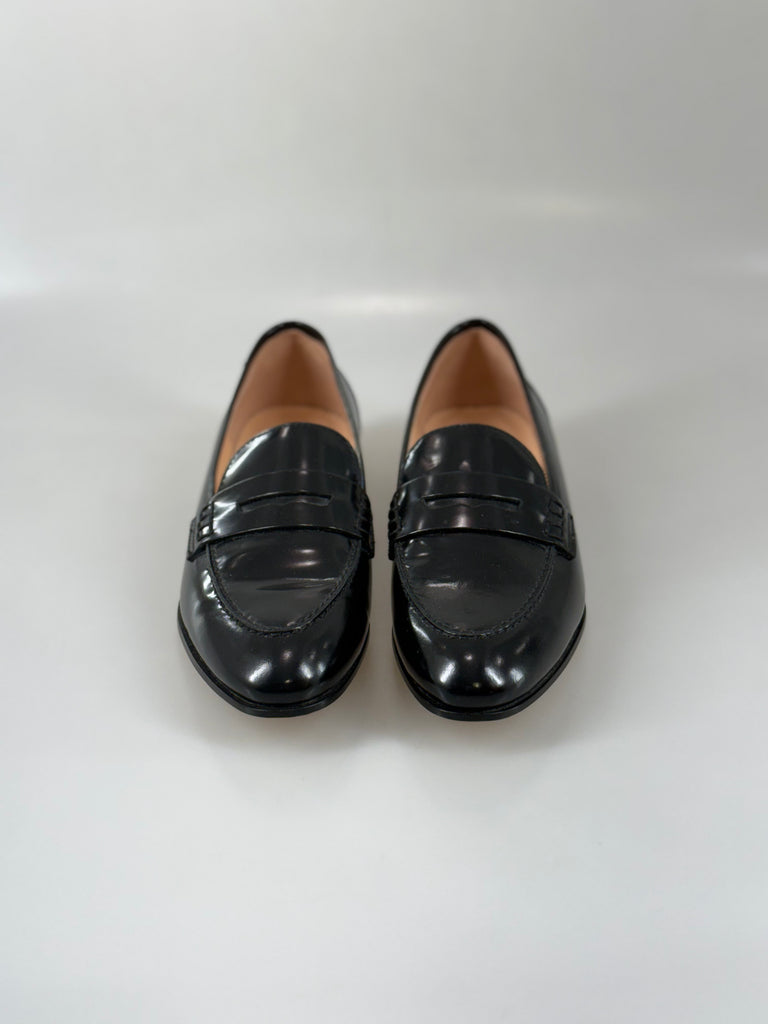 Dessa svarta loafers i glansigt lack från J.Crew balanserar klassisk design med en chic finish. Med sin minimalistiska design, diskreta rundning och eleganta glans är de perfekta att bära både till vardags med jeans som till en dressad kvällslook. En stilren sko med karaktär – för dig som vill kombinera komfort, kvalitet och design i ett enda steg.