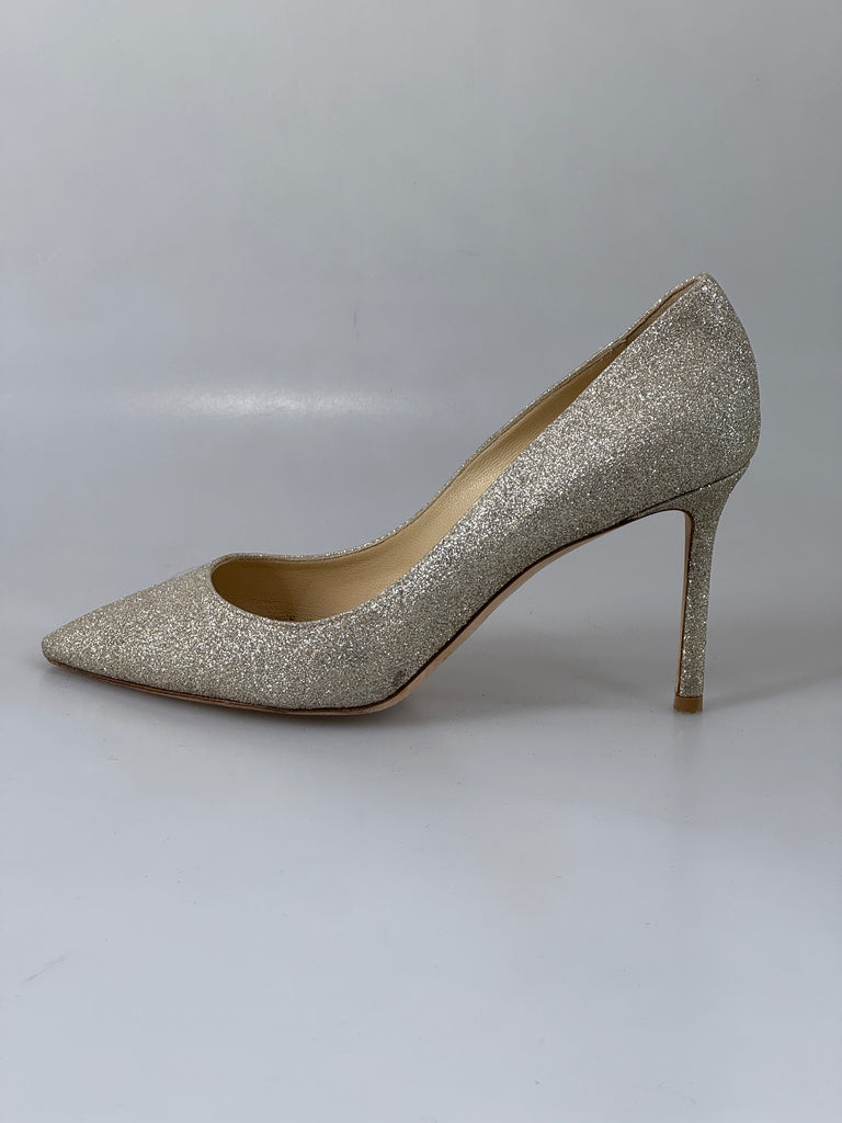Låt dina steg glittra med full glamour i dessa Jimmy Choo-pumps. Den klassiska silhuetten kombineras med en skimrande finish som fångar ljuset från alla vinklar och förvandlar varje rörelse till ett ögonblick av ren elegans. Perfekta för fest, gala, middag eller när du helt enkelt vill addera exklusiv lyx till din look. Tidlös design möter gnistrande statement i en varm färg – ett par skor som garanterat sätter pricken över i:et.