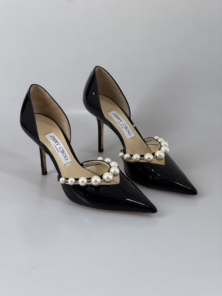 Ren elegans med dessa ikoniska Jimmy Choo-pumps – den svarta, glansiga ytan fångar ljuset och adderar det lilla extra till varje outfit. Den spetsiga tåformen skapar en sofistikerad silhuett, medan pärlbandet tillför en touch av couture-känsla. Dessa pumps är perfekta för dig som vill kombinera klassisk glamour med modern edge. Oavsett om det gäller en gala, ett bröllop eller en kväll ute, drar de alla blickar till sig.