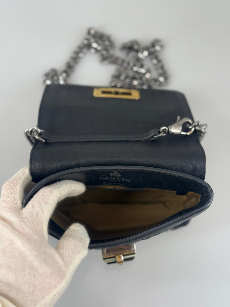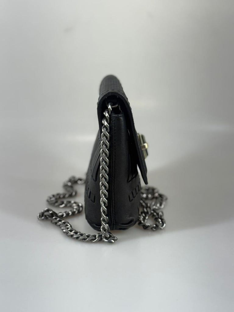 Vintageinspirerad väska från Lanvin med tydlig karaktär från 2015. Den svarta läderytan är flätad i ett diskret mönster som ger struktur och djup utan att ta över. Ett markant spänne framtill bryter av det mjuka intrycket och ger väskan en distinkt siluett. Kedjan är i mörk silverton, något dämpad i glansen och vacker i kontrast mot lädret. En modell som bärs med självklarhet – lika delar välklätt som avslappnat.