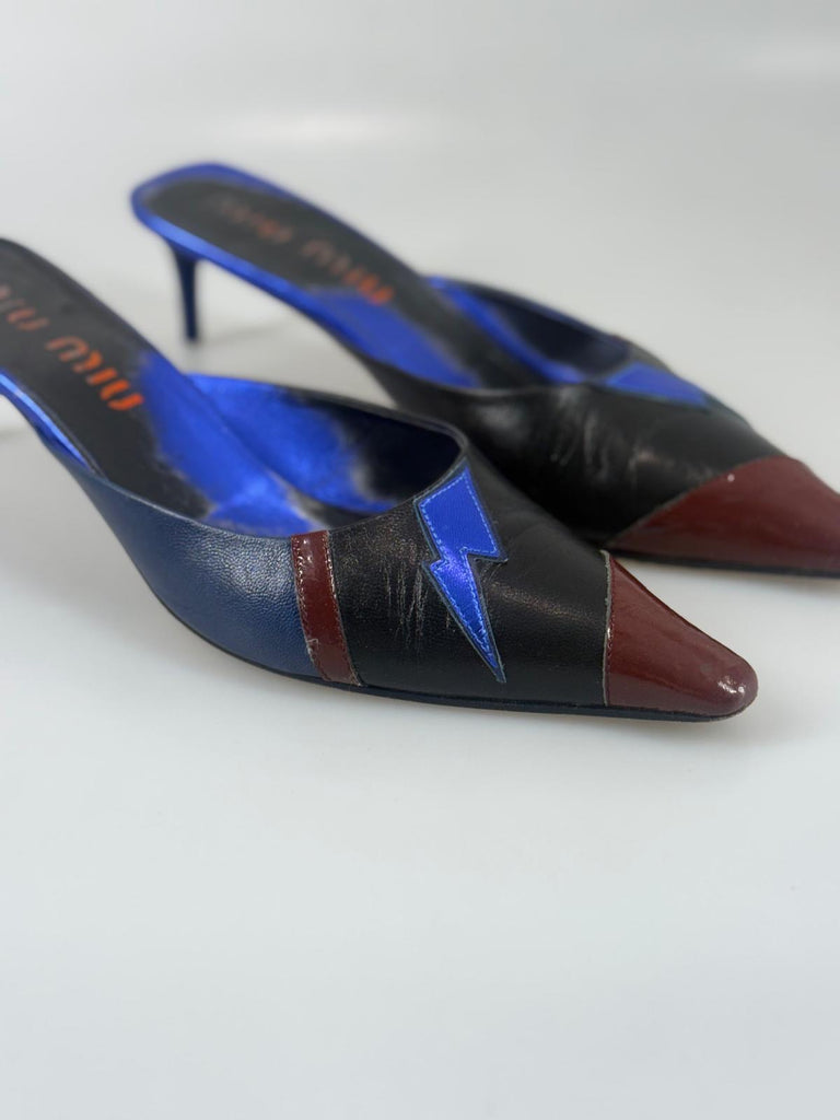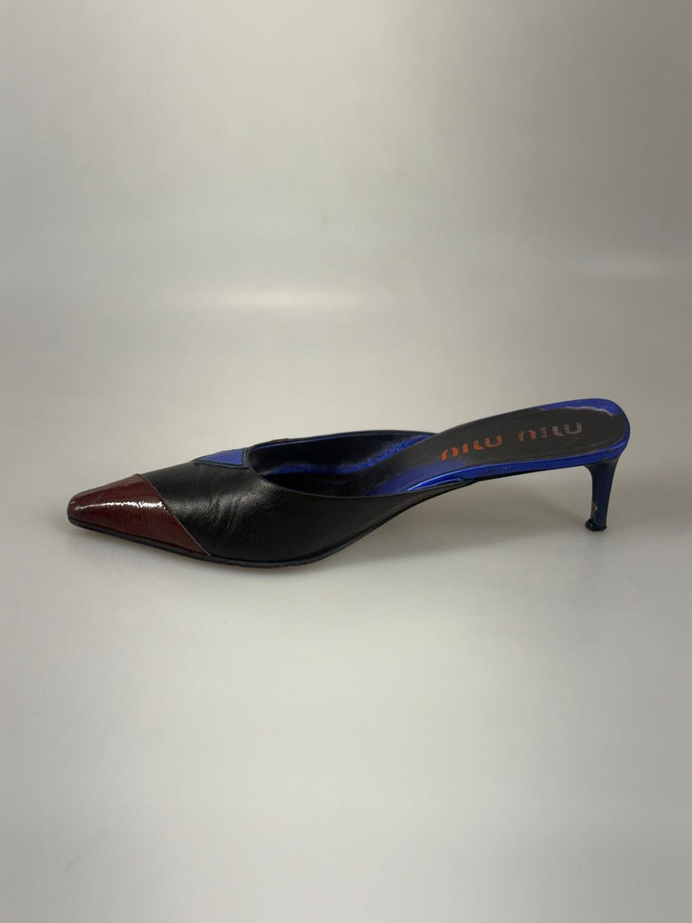 Eleganta vintage mules från Miu Miu i en unik och häftig färgpalett av svart, blått och vinrött. Designen kombinerar en smakfull silhuett med lekfull färgsättning och skapar den där ikoniska italienska elegansen som märket är känt för. Modellen Flash sandals mules har ett stilrent snitt som är både trendigt och tidlöst – perfekta att bära med allt från jeans till klänning. Perfekta för att skapa en självklar fashion-forward look.