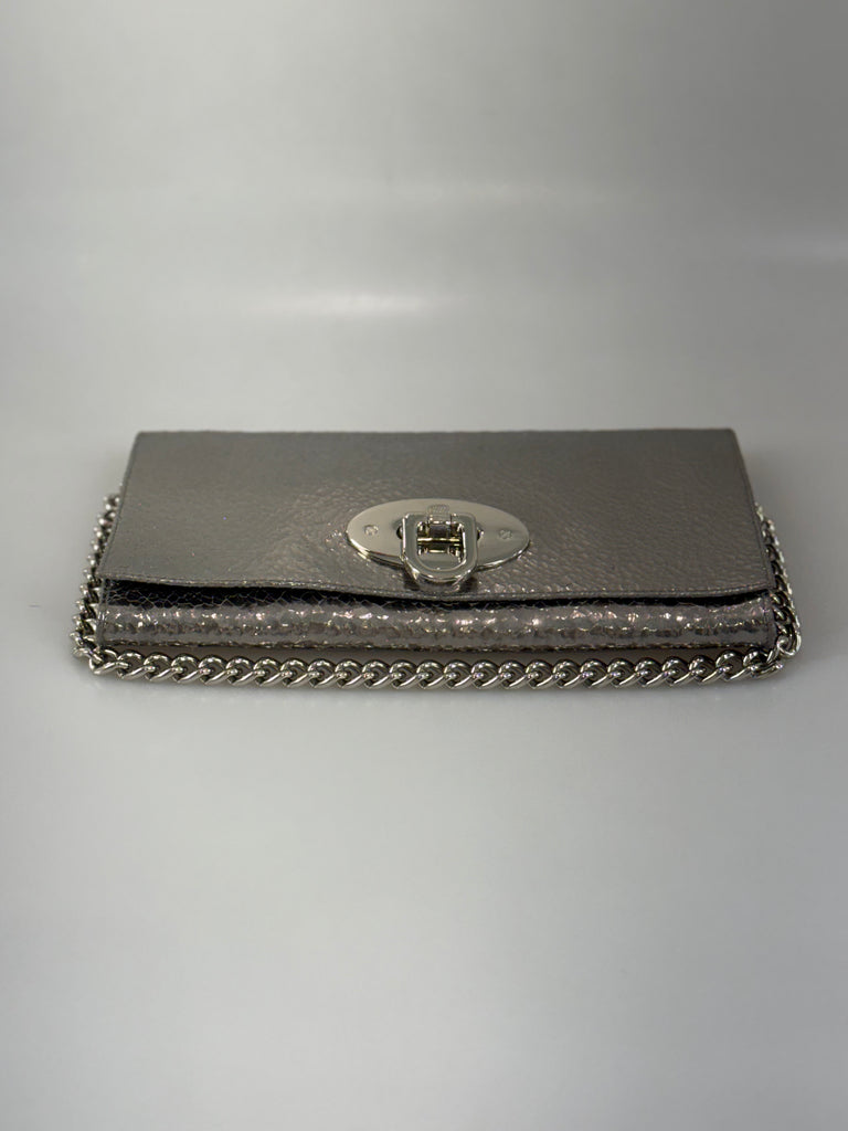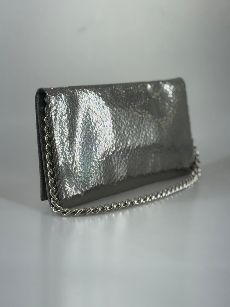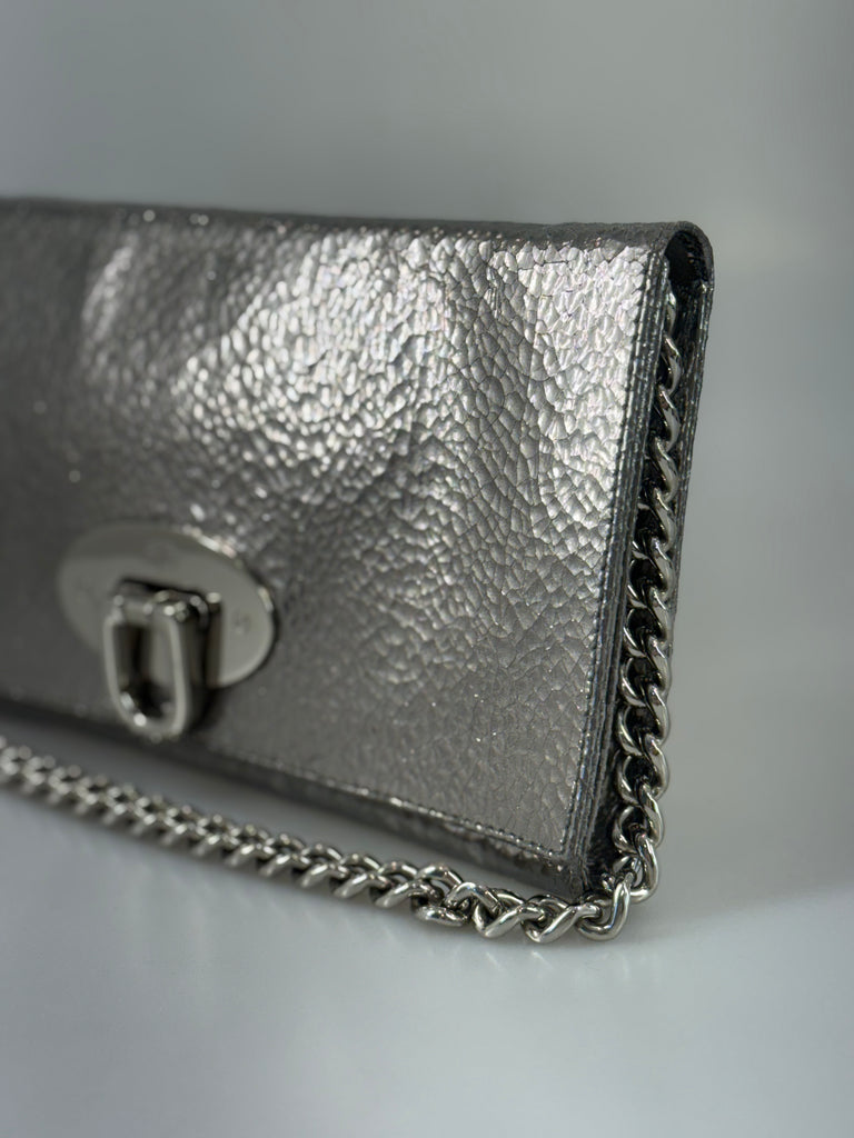 Mulberry Lily festväska/clutch i silver med vacker yta som ger liv och rörelse – nästan spräcklig i uttrycket, med subtila skiftningar som fångar ögat. Det klassiska Mulberry loggan med trädet på spännet framtill, i samma silverton som kedjan, adderar en stilren men chic detalj. Väskan balanserar det sobra, attityd och det lekfulla – något som gör den lika självklar till vardags som till kväll. Den bärs nära enkelt över armen och har en lätt känsla i handen – den drar blickarna till sig utan att behöva ta över. En modell med modern skärpa och karaktär.