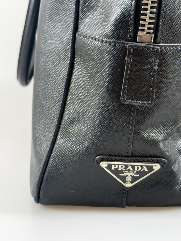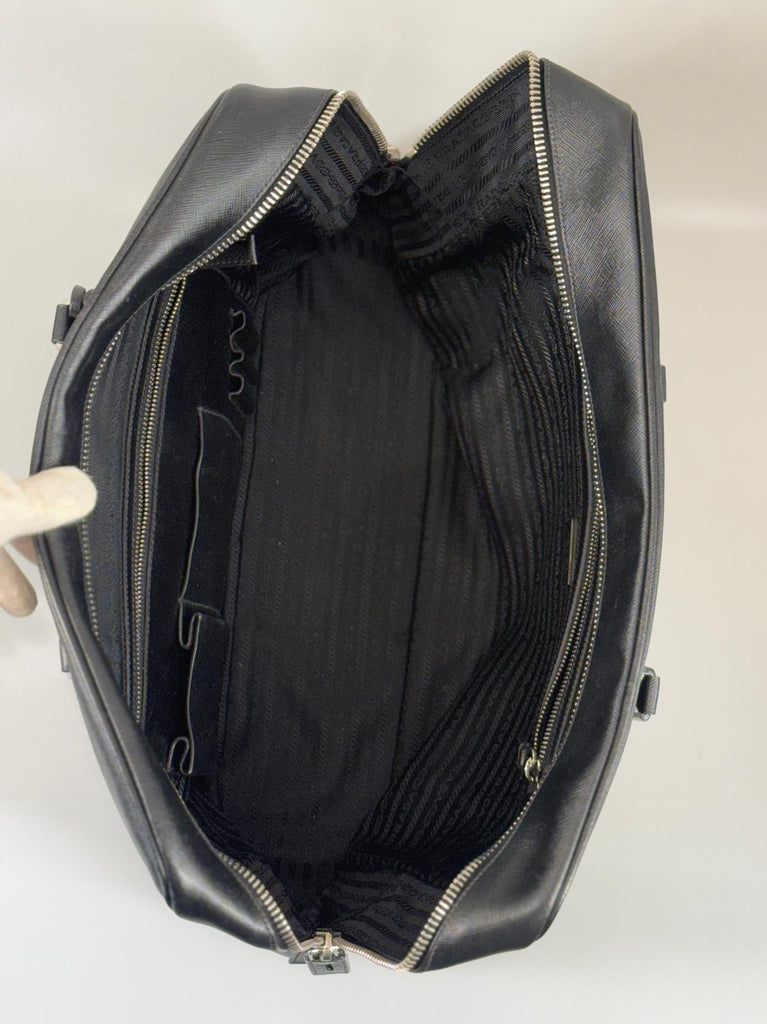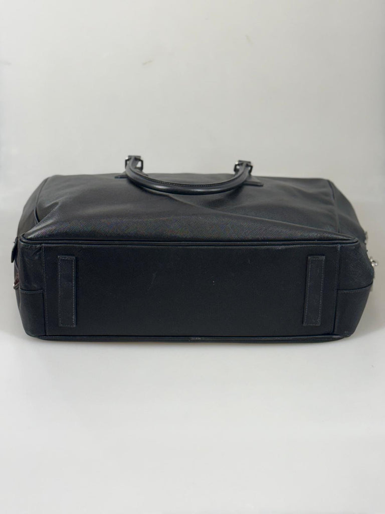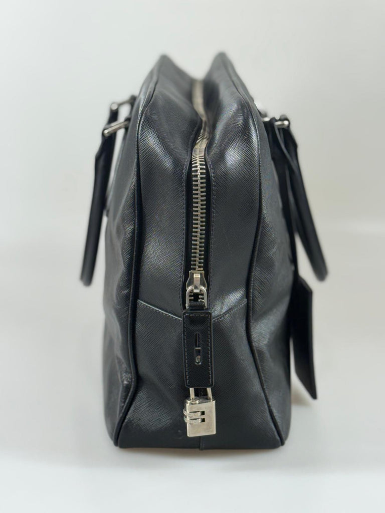 Denna svarta portfölj från Prada kombinerar italiensk elegans med skandinavisk minimalism, tillverkad i det ikoniska saffiano-lädret som skapar en snygg och slitstark struktur. Med sin stilrena design, diskreta logotyp och genomtänkta inredning är den det perfekta valet för den modeintresserade. En smidig och elegant följeslagare som rymmer både dator och dokument – utan att kompromissa med stilen.