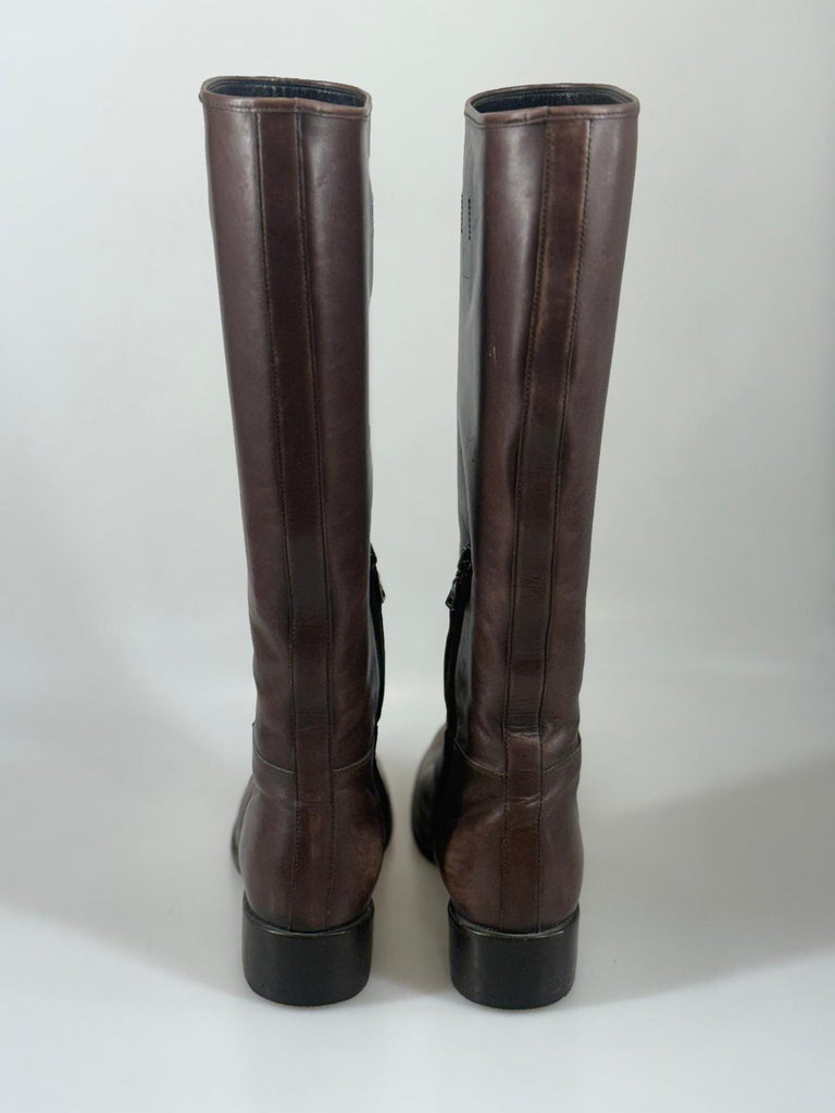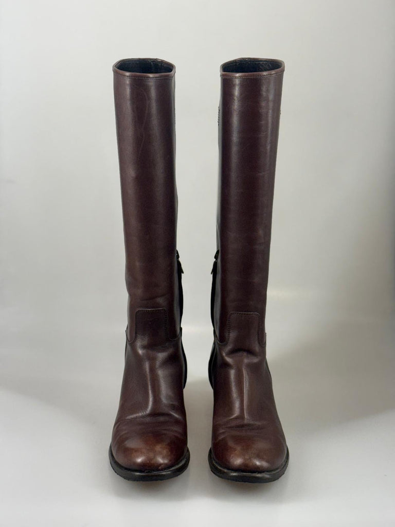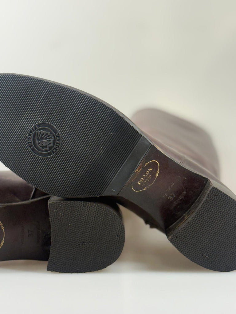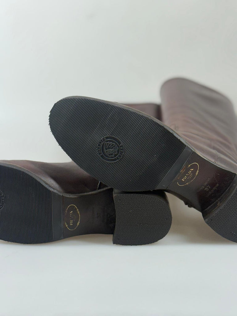 Klassiska stövlar från Prada i en mörkbrun nyans – ett tidlöst och sofistikerat val. Det mjuka, följsamma skinnet och den stilrena, klassiska siluetten ger en elegant finish som fungerar lika bra till vardag som till mer uppklädda tillfällen. Den djupa chokladbruna tonen tillför värme och djup, medan den genomtänkta designen speglar Pradas välkända italienska hantverk. Ett par stövlar som kombinerar ren design med subtil lyx och en självsäker, tidlös stil.