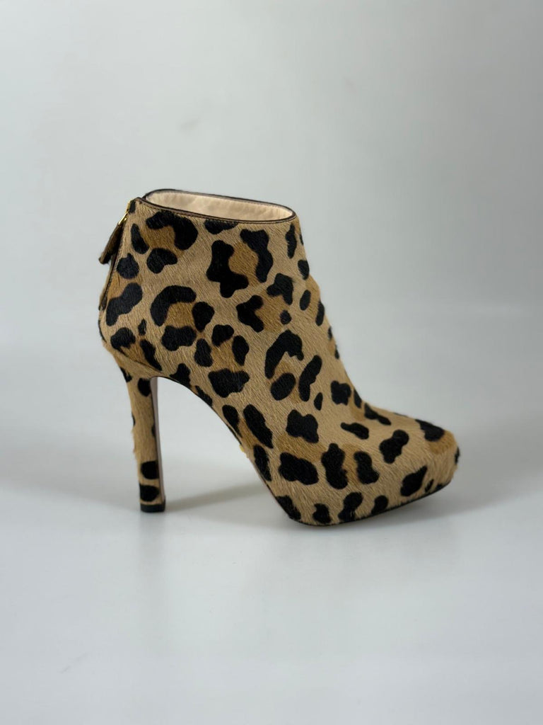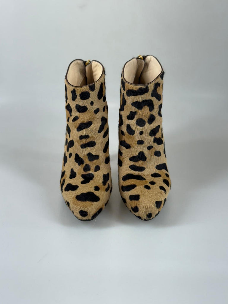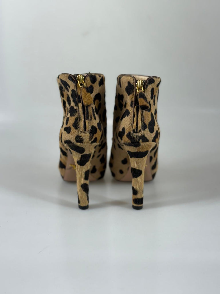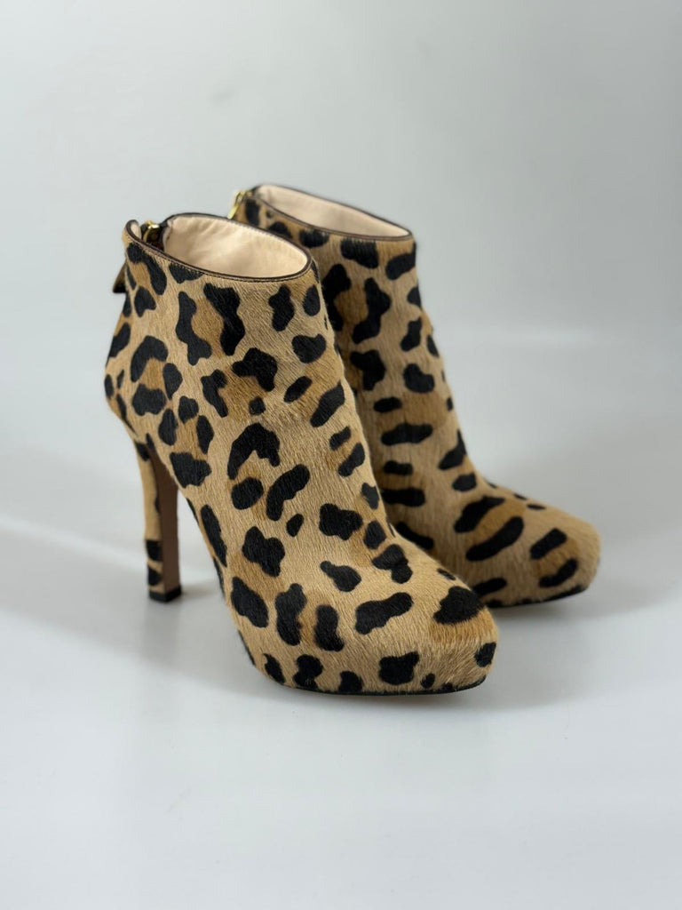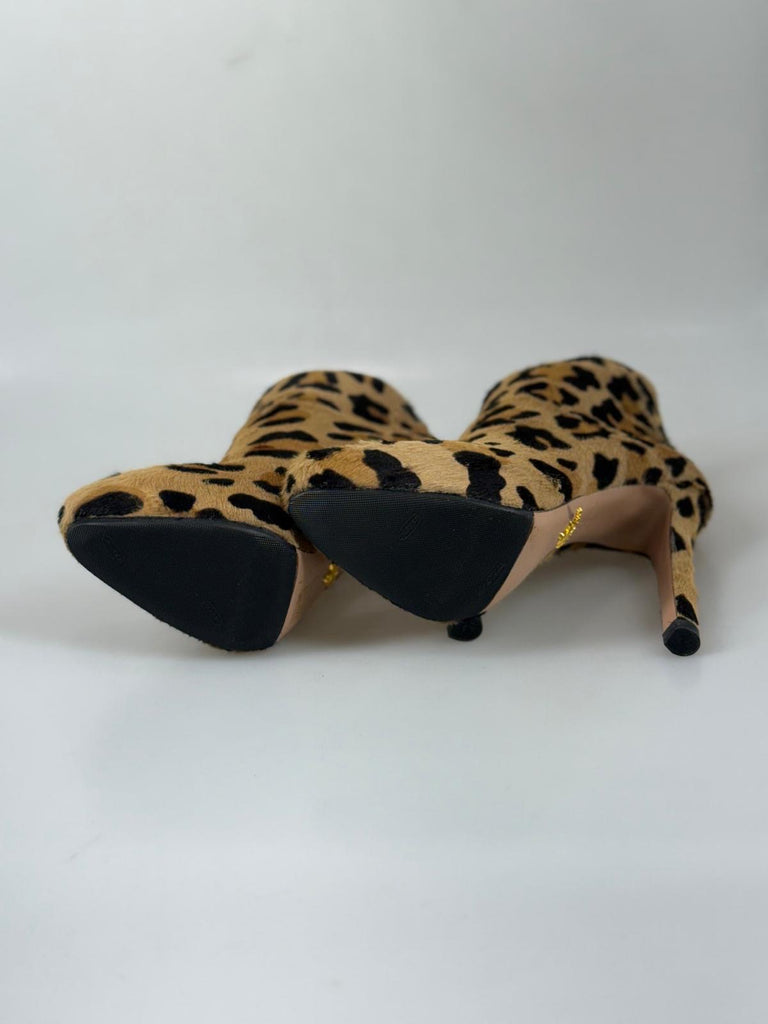 Gör ett oförglömligt intryck med dessa exklusiva Prada stövletter i mönstrat koskinn. Den häftiga texturen och ytan kombineras med en smickrande klack och diskret, skulpterad platåsula, som ger både höjd och stabilitet. Resultatet är en statement-sko som balanserar high fashion med maximal bärbarhet. Perfekta för dig som vill addera en touch av djärv glamour till garderoben – lika slående till enkla jeans som till kvällens mer vågade looks. En ikonisk design som fångar Pradas häftiga själ. Tillverkade i Italien ca 2017.