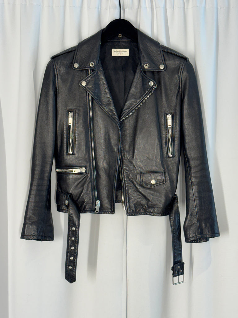 En ikonisk bikerjacka i mjukt skinn från Saint Laurent – ett tidlöst statement-plagg med attityd och elegans i perfekt balans. Den klassiska biker-silhuetten med markerade slag, asymmetrisk dragkedja och genomarbetade metalldetaljer ger en självsäker och distinkt look. Skinnet är av hög kvalitet med en mjuk men strukturerad känsla som formar sig vackert efter kroppen. Ett plagg som lyfter vilken outfit som helst – lika självklar över en enkel t-shirt och jeans som över en klänning för en mer kontrasterande, chic styling. En investering i stil som aldrig går ur tiden – edge, elegans och omisskännligt ikonisk.