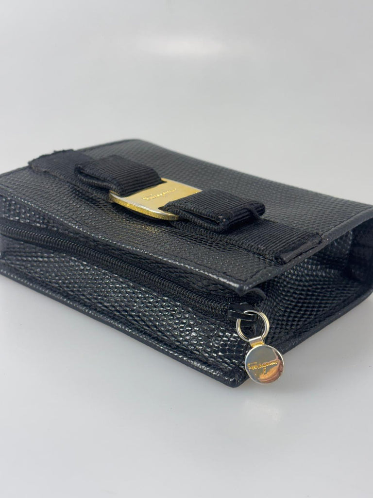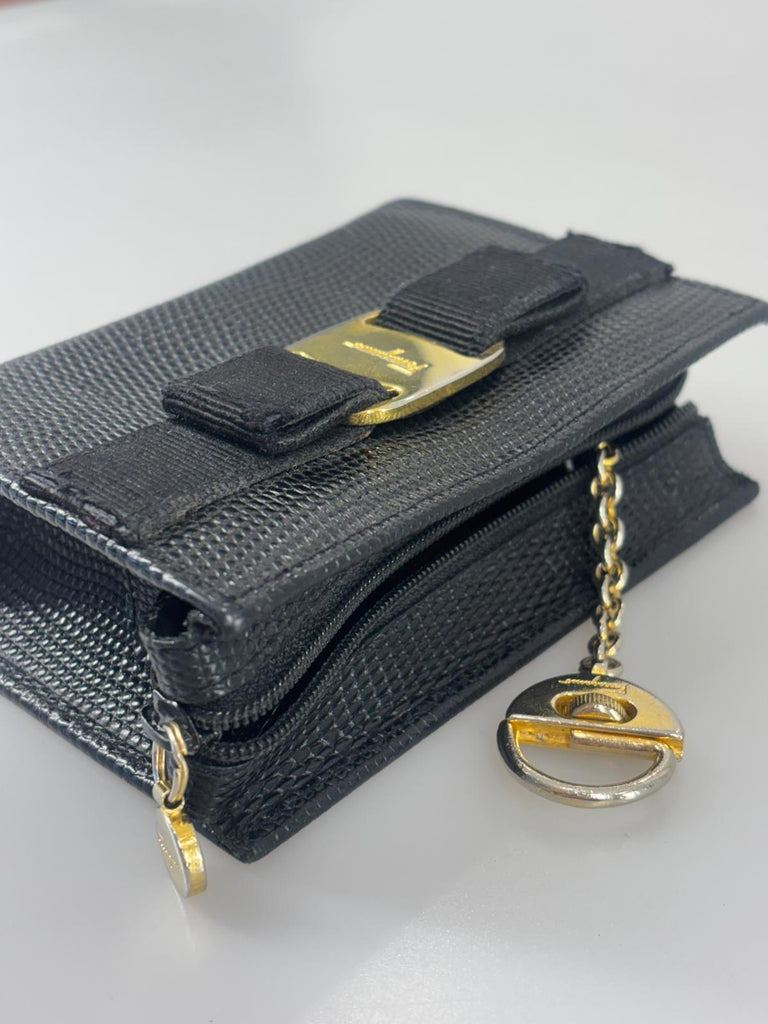 Klassisk nyckelhållare från Salvatore Ferragamo i svart läder med märkets ikoniska Vara-rosett och guldtonade metalldetaljer. Den djupa svarta tonen, det subtila lystret i lädret och de eleganta metall inslagen kombinerar tidlös italiensk design med en modern känsla. Med sin stilrena och funktionella design är denna tidlösa Ferragamo-accessoar en elegant detalj för den som värdesätter kvalitet och diskret exklusivitet, passar perfekt till vardagligt bruk eller som en stilfull detalj till din väska. Original dustbag och box medföljer.