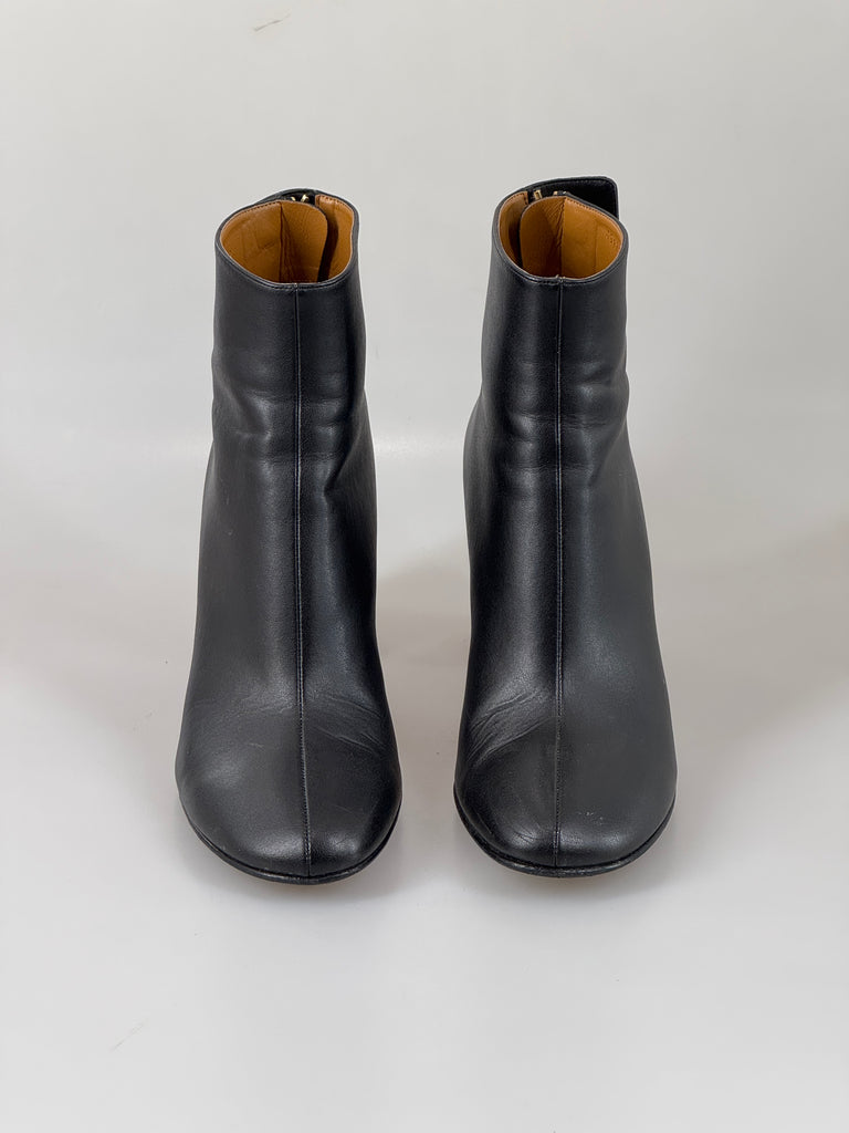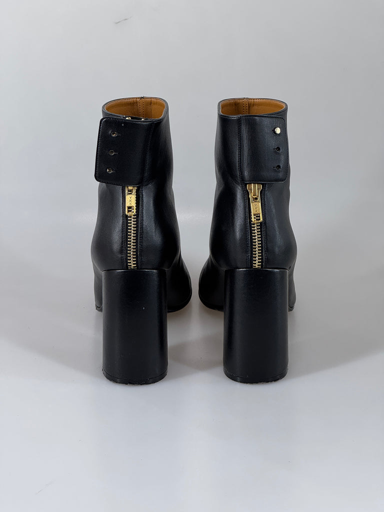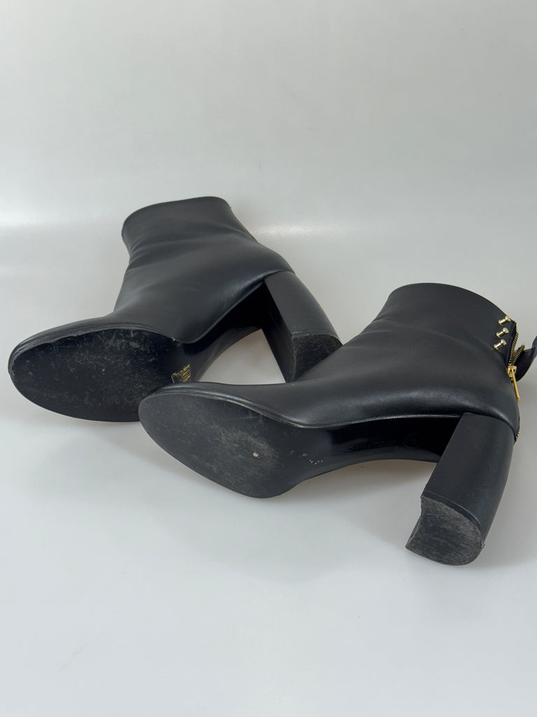 Ge looken ett sofistikerat edge med dessa svarta ankelstövletter från Stella McCartney. Tillverkade i slitstarkt veganskt läder, skapar de en elegant och ren siluett som smickrar både ben och outfit. Spännet adderar en chic detalj utan att ta över intrycket. Den nätta skaftlängden och den välbalanserade blockklacken gör dem lika självklara till jeans med en oversized kappa som till en skräddad kvällslook. Ett stilrent statement som adderar modern elegans till den välklädda garderoben.