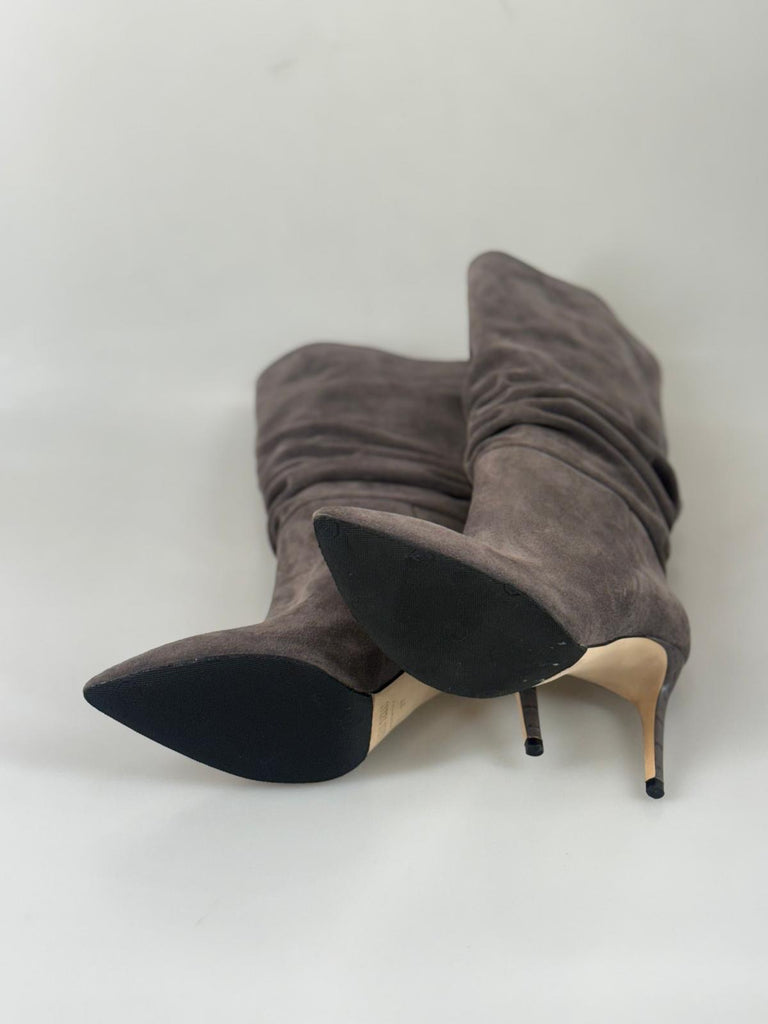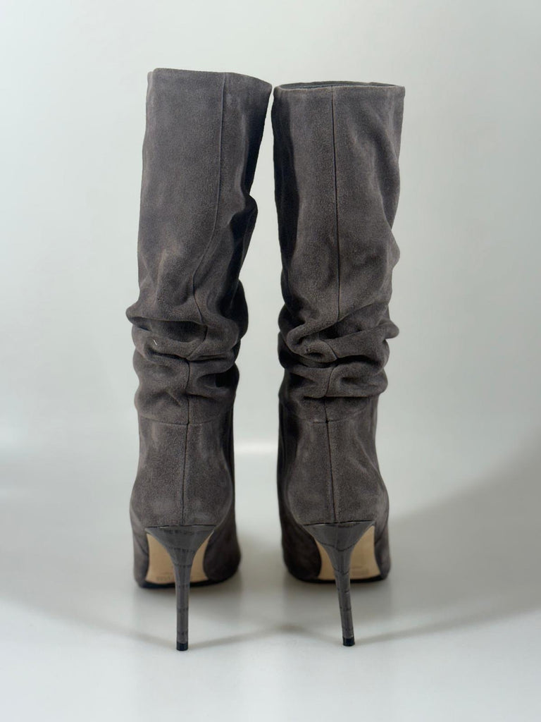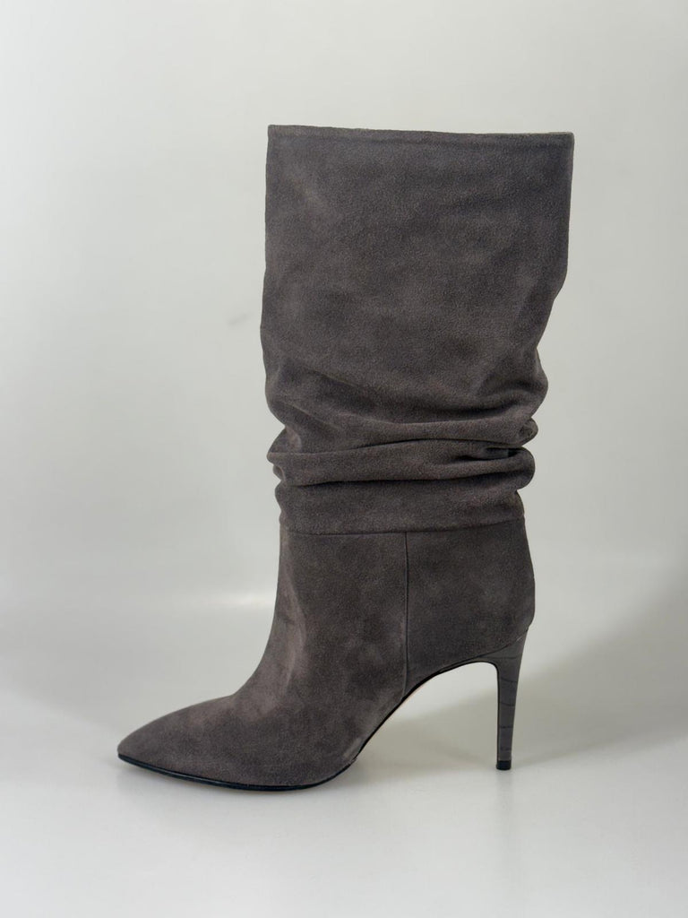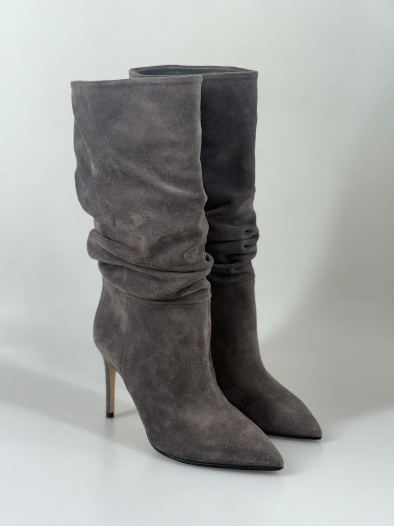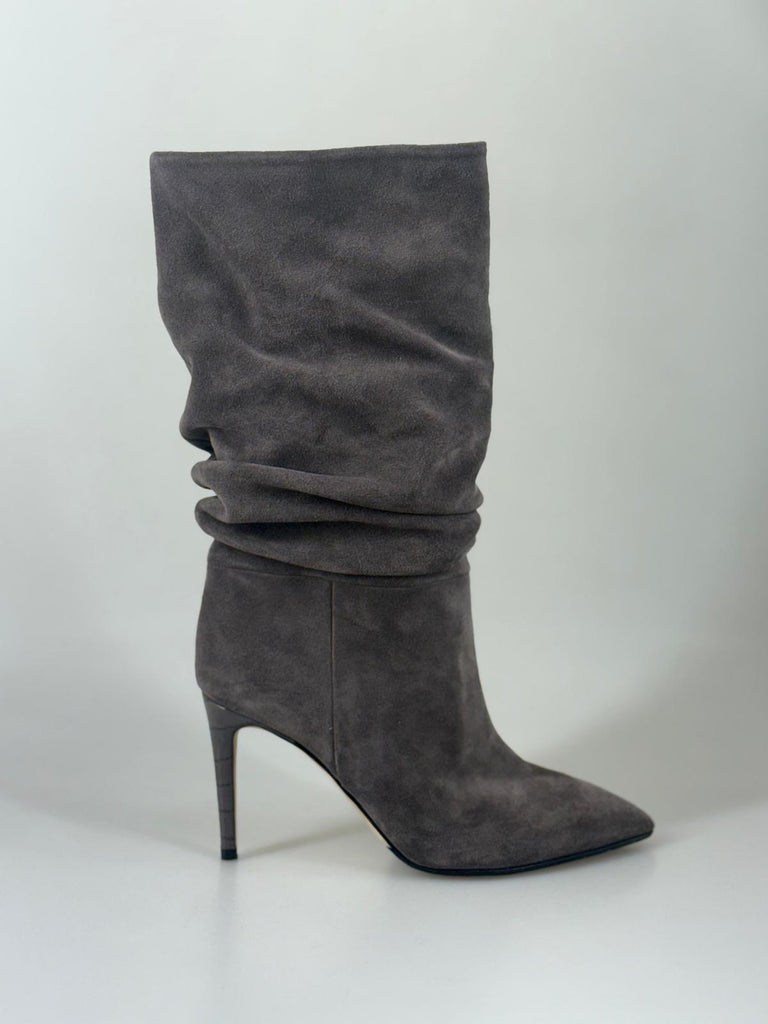 Texas Paris stövlar i en chic modell i mjuk grå mocka. Det vackra, naturliga fallet kring ankeln skapar en draperad effekt som ger stövlarna ett unikt och fashionabelt uttryck. Den spetsiga tån förlänger silhuetten och adderar en distinkt, modern edge, medan den smala klacken — klädd i krokodilmönstrat läder — ger varje steg en elegant touch av statement. Ett par stövlar som sömlöst kombinerar struktur och mjukhet. Perfekta för dig som vill lyfta varje look med chic, elegant stil. Ej dustbag eller box.