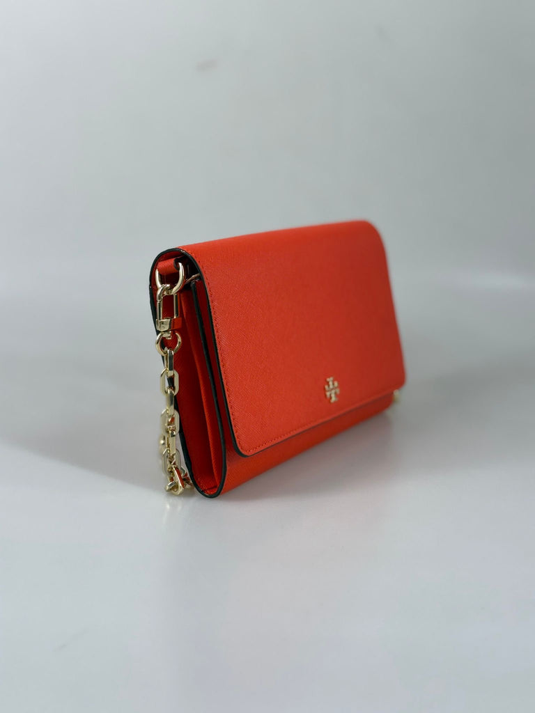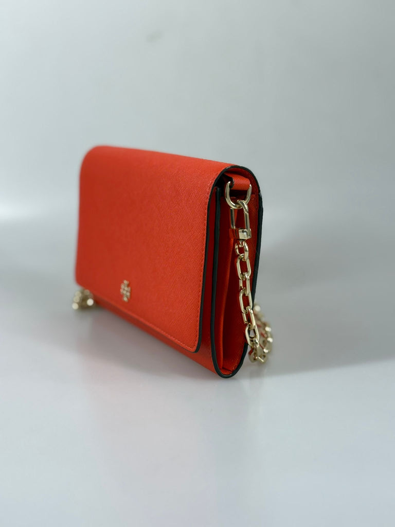 En stilren handväska från Tory Burch i en härlig röd nyans som utstrålar självförtroende och tidlös elegans. Den rena designen ger en elegant look medan den varma färgen ger en lekfull touch. Den guldfärgade kedjan adderar en modern edge och skapar en häftig kontrast mot det röda lädret, likt den klassiska loggan som pryder framsidan och blir en vacker detalj. Med spännen går kedjan även enkelt att ta av för att skapa en elegant clutch. Lika perfekt för kvällens tillställningar som för att lyfta en stilren vardagslook. En statement-accessoar som sätter pricken över i:et utan att ta över.